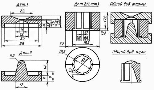 Фото 6 и 7: Сами детали и их размеры. Очень важен правильный кант на калибровочной гайке. Он нужен не только для того, что бы ни сплющить закраину, но и играет роль направляющей в станине (фото 3) при переворачивании и выбивании гильзы после калибровки.