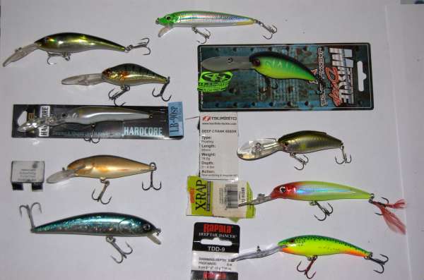 Хорошо работают L-minnow от Yo-Zuri (второй ряд сверху, первые два), Дамики Пирами (второй ряд третий слева), хорошо разловил A-elita crank, причем крому щуки и окуня ловил на него и жереха и судачка (5-й ряд второй слева), Cultiva Rip'n Minnow (6-й ряд, третий слева)