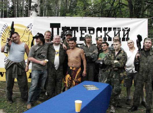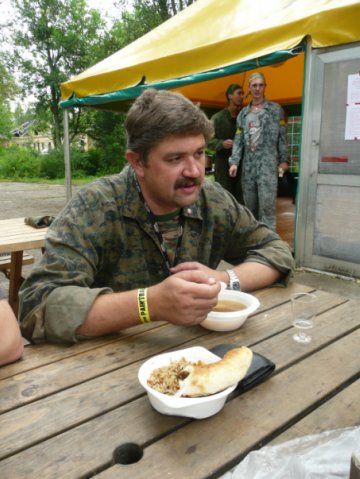 2-го августа выехали в поселок Аголатово. Приняли нас дружелюбно, выдали снаряжение, познакомили с "противником", проинструктировали и дали сирену! Первый бой получился "блином";) А дальше.... вообщем мы их сделали! После серии проведенных боев, был организован обед с узбекским пловом, приготовленным на костре в большом казане настоящим представителем братского народа:) После обеда Президент пейнбольного клуба Ринат Габидуллин, организовал пистолетную дуэль для всех желающих. Желающих было меньше, чем играющих, видимо сказался сытный обед! Ближе к вечеру, было проведено еще пару боёв.