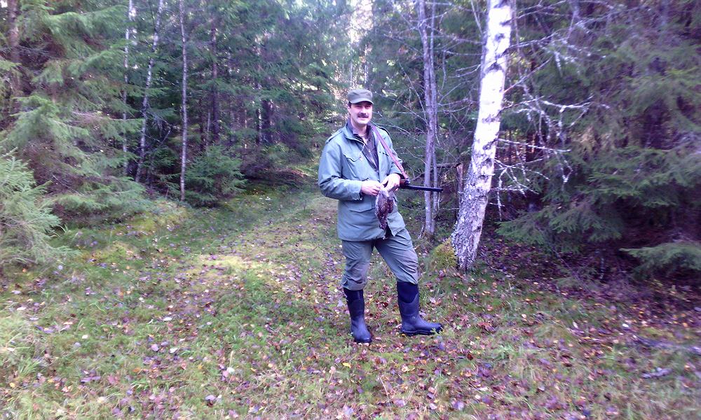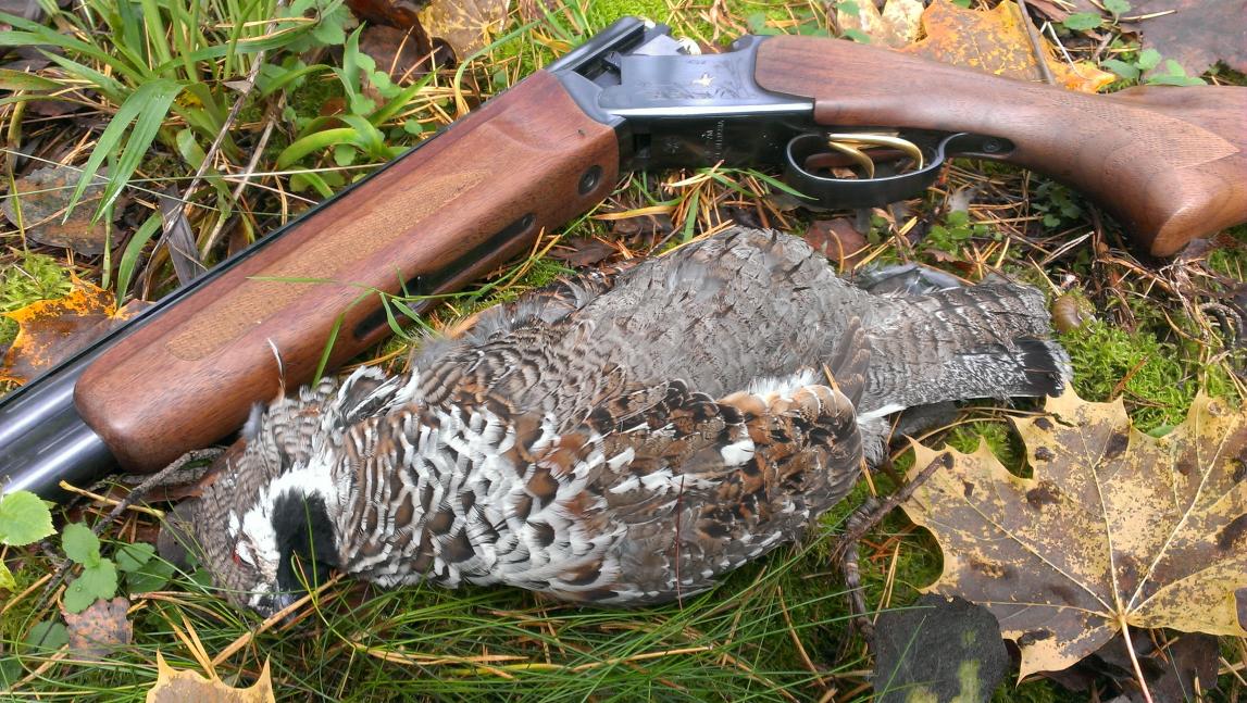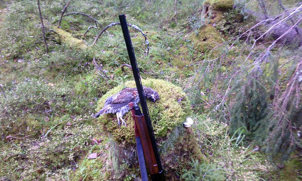 У друга ситуация была по-лучше, рябчик к нему прилетал, но садился все время вне зоны видимости. То ли он не удачно выбрал место, то ли рябец его срисовал, но под выстрел так и не вышел. Решили не мучить пуганых и перейти еще дальше. Вскорости друг взял одного, а мне не отзывались. Попутно набрали грибов и двинулись уже в сторону машины. Тут я заметил движение на земле за елочкой метров в сорока. Замер, поднял ружье, подождал минутку, рябчик вышел. Выстрелил пятеркой из чока, рябчик перелетел на согнутую березку в рядом с елочкой. Странно. В получоке спортинг, выстрелил, рябчик упал. Подхожу, лежат оба, парочка молодых, вот оно что, значит не пустым вернусь.