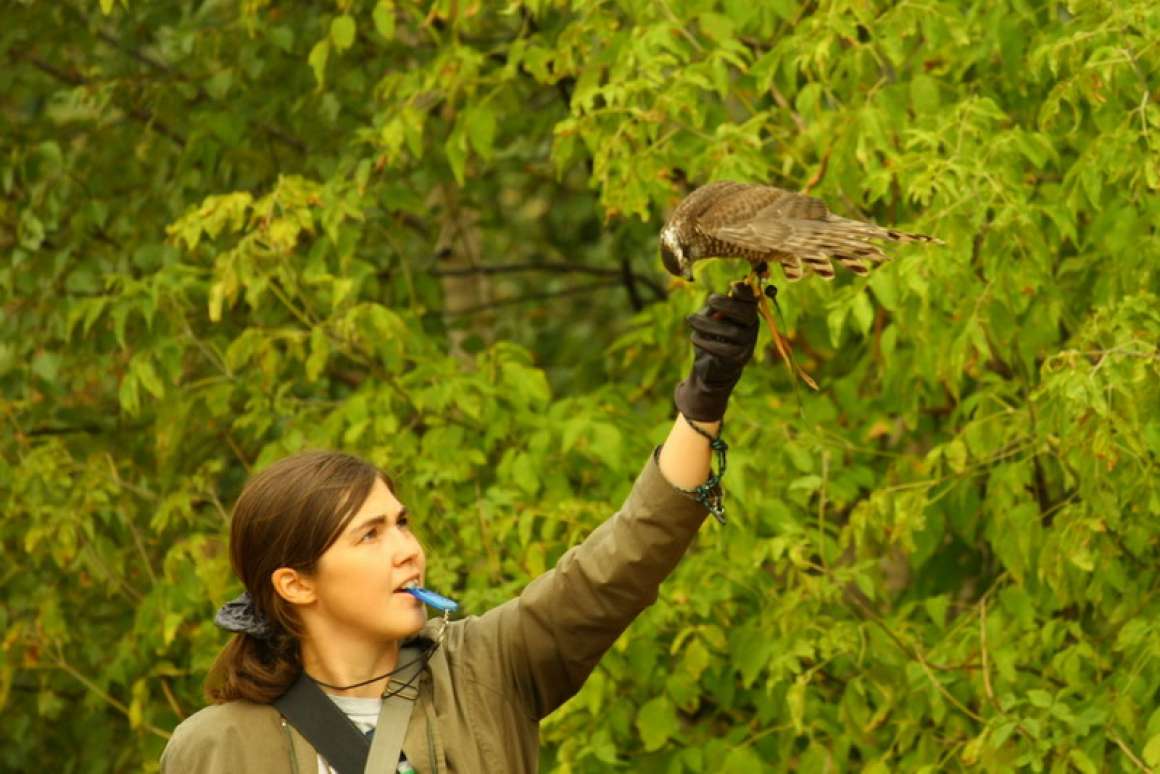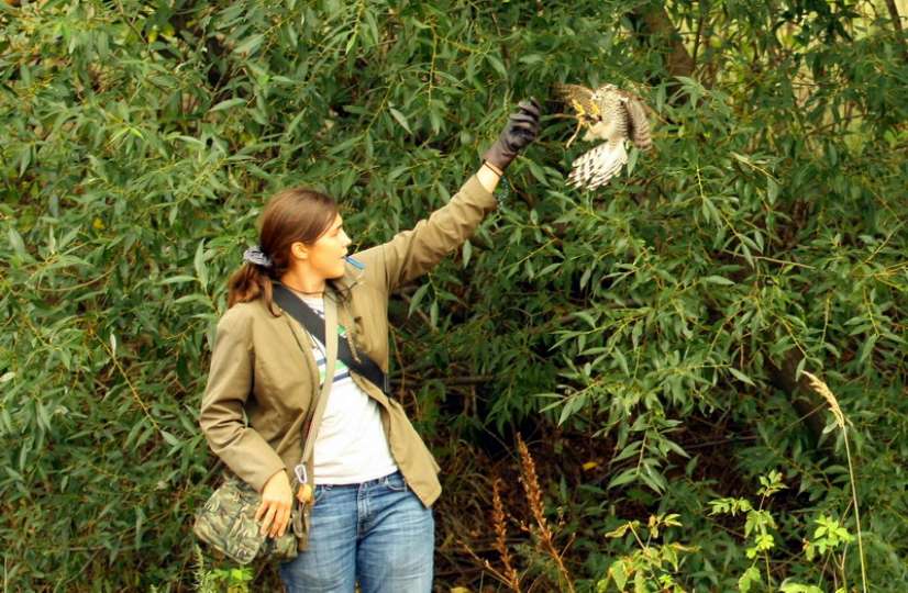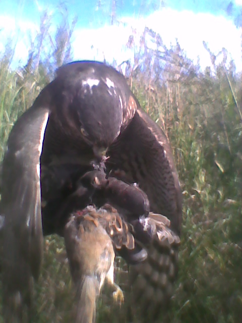Сзади слышу удивленно-восторженные реплики ребят. На бегу кричу им оставаться на месте, сама прыгаю к заветной куртине. Трава густая, бубенцы уже слышно, теперь важно не напугать перепелятницу и не наступить на нее. Поэтому достаю приемник - настройка у него такая точная, что он четко показывает мне, на каком именно квадратном полуметре сидит моя птица. Бормочу что-то успокоительное чтобы обозначиться птице, раздвигаю траву - все отлично, Монстро спокойно мотрит на меня из травяного колодца. Отсюда она не сможет утащить добычу при всем своем желании. Коростель в лапах, уже не дышит, хорошо. Пристегиваю птицу и зову ребят на фотосессию.