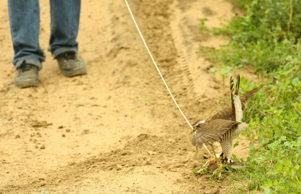 В голове вьется мысль что надо бы птицу отстегнуть от привязи - вдруг, ну бывают же чудеса, наступим на куропаток - а хуже нет обломать птицу взлетающей из-под ног дичью и невозможностью полета за ней. Подсадная перепелка есть, в крайнем случае, на нее на точно слетит. Отстегиваю, держу крепко.