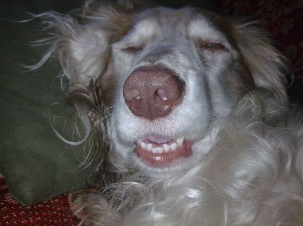 Мой пес улыбается, когда лежит на спине, передние и задние лапки зайчиком, ему чешешь брюшко или щекочешь.... Уморительная картина!!!
