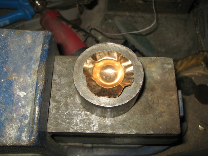 Там приведена серия фото всего процесса, края КРУГЛОЙ заготовки почти полностью утягиваются при выстукивании.