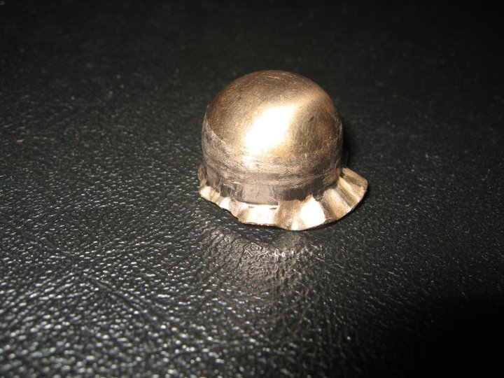 не менее 100 ватт. Кстати! Проверил версию о толщине металла - делал из 0,6мм, может чуть больше (микрометра не было) - получилось вообще - ровненько!!! Вес - 7,3-7,2 гр. - готовое изделие (на тетерю, диаметр 19мм). Еще на фотке №6 видно, что полусфера основательно обтачивается на крупной наждачке. Надо, кстати, тоже нормальный мотор прикупить)))
