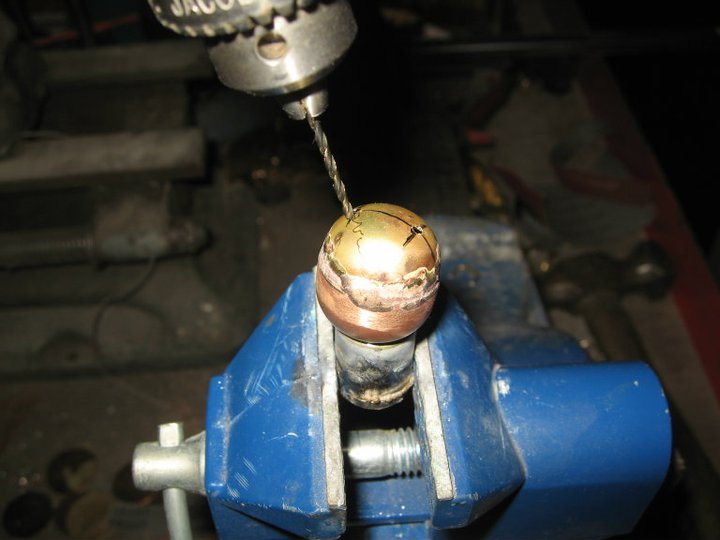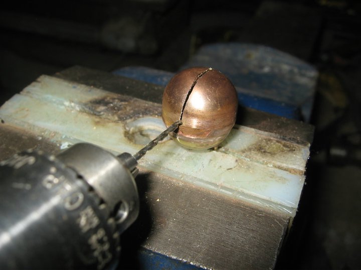очевидно сверлить не удобно...кернить ,дефорируется полусфера, а так на скорости сразу сверло входит в щель и пройдя полусферу по оси выходит на противоположной стороне...получается симметрично...я тож так делал.