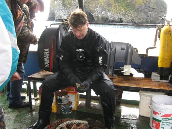 Тем временем, штатный водолаз, не взирая на волнение моря, занырнул в гости к Нептуну и тот одарил его сеткой первоклассных морских ежей….