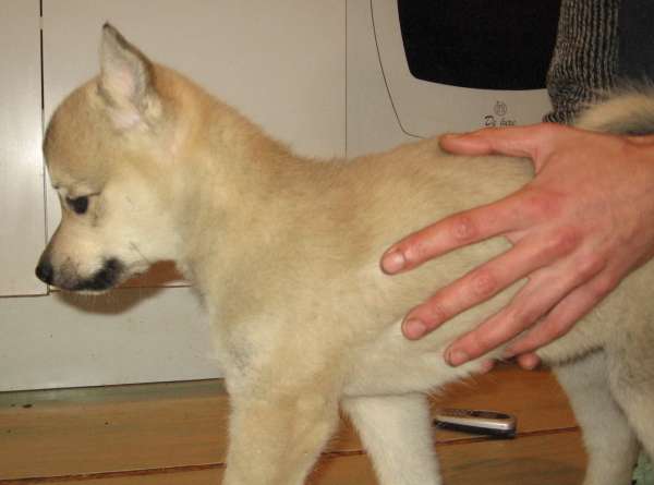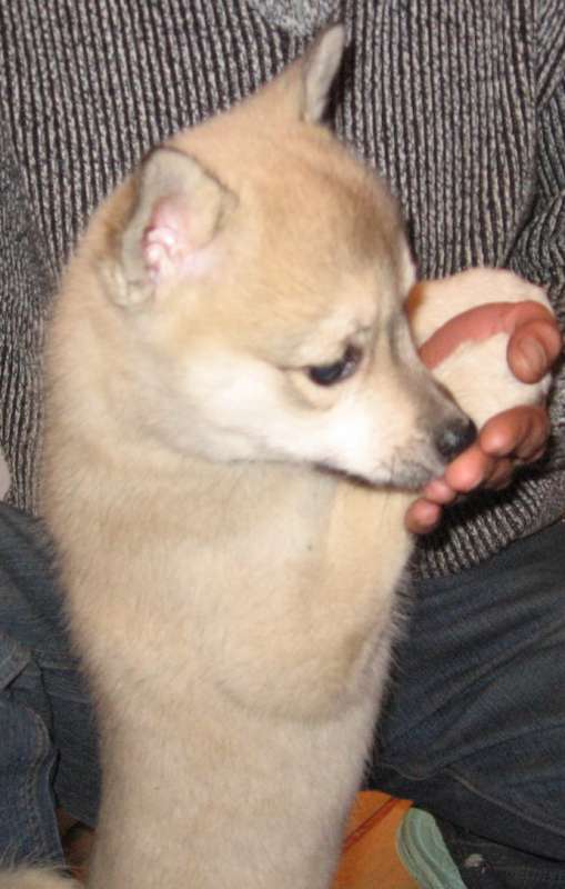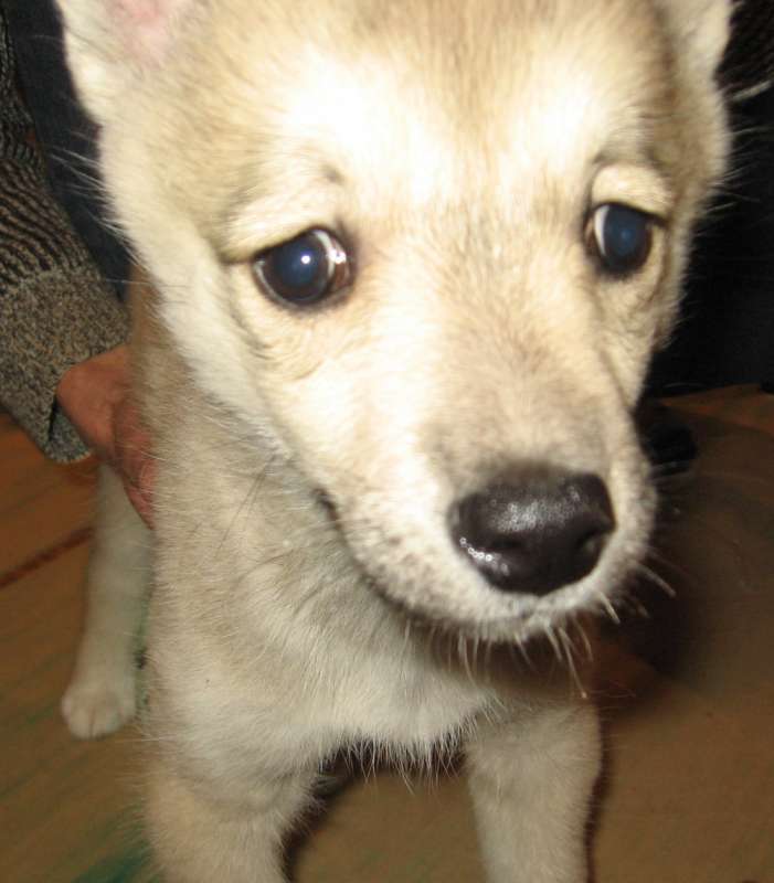 Блин, хвост полтора кольца, уши торчком, окрас допустимый вроде, щенку полтора месяца. Да и мать точно лайка. ))) Голова может ещё исправится - а?