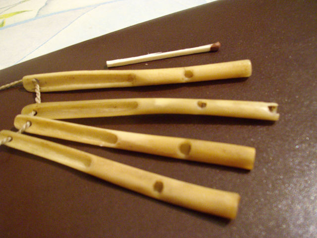 Шарик из пластилина загоняется в костяшку и формуется пробочка, при помощи двух "поршеньков". Затем той самой иглой, со стороны куда дудеть, делаем дырочку в верхней части пробки.