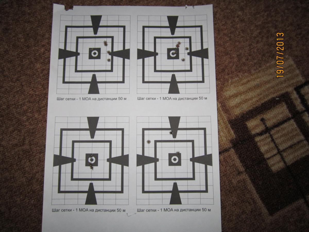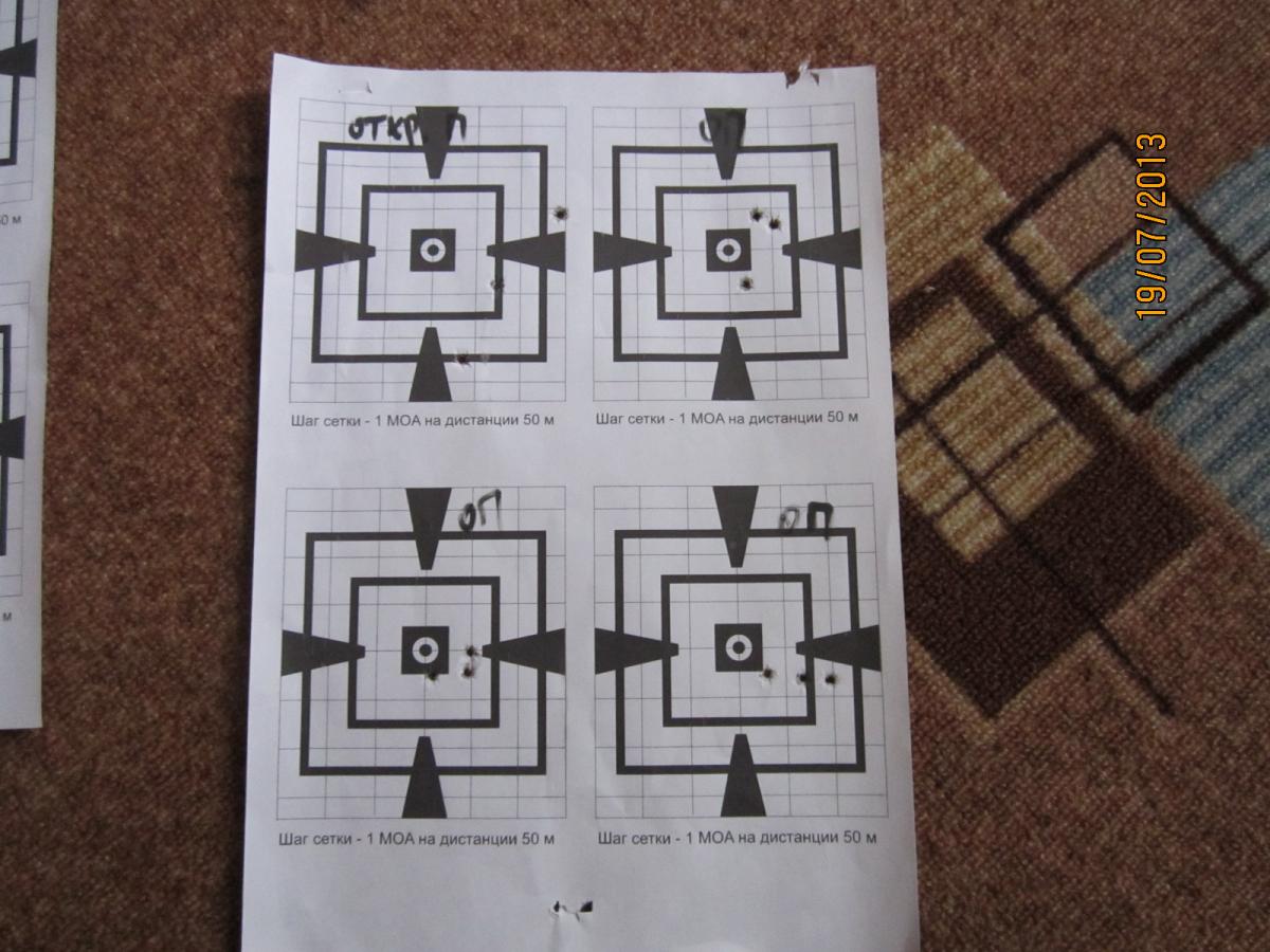 На 50 метров с открытого немалый разброс (левая картинка, левая верхняя мишень), С оптики лучше, но все равно есть необъяснимые отрывы. Правда моя стрелковая подготовка оставляет желать лучшего.