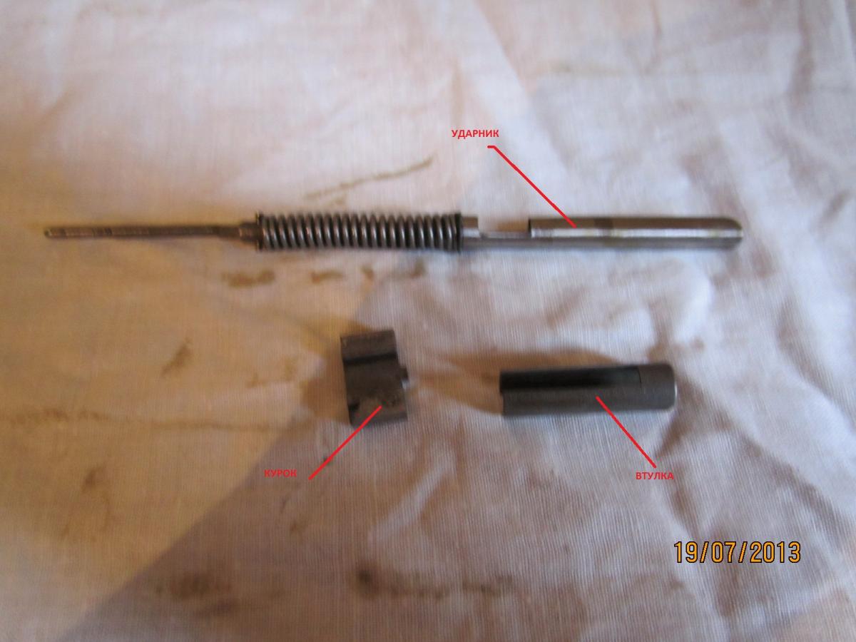 Снимаем с ударника втулку и курок. Чистим, смазываем и вставляем обратно. Сделано с защитой от дурака - неправильно не поставить.