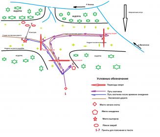 Покурил слегонца и пошёл дед дале. Шёл-шёл и раз... В пункте 2... О счастье... След звиря нивиданного и при том предположительно не одного. С вечера, нужно заметить, метель была и следы сильно заметены были. Но дед-не промах-не одного Горыныча к тому времени завалил. Направление определил и пошёл дале ибо пока следы эти ему ни о чём вообщем то обещающем не говорили. И шёл бы он так себе и шёл, но в пункте 3 (смотрите схему) повстречал те же следы и следы эти были, как и первые вообщем то жировочные... Кормились чудо-юды.