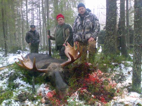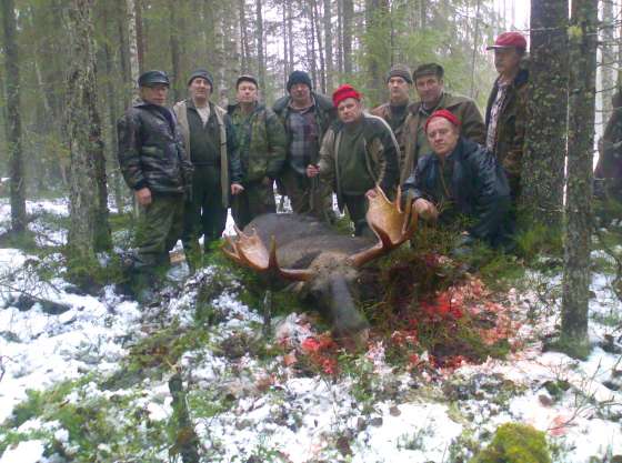 Увы два лося, один с шикарной короной рогов вышли на левом фланге и обогнули крайний номер…все теперь все, загон закончился. Время 12 часов 30 минут. Можно посмотреть трофей и выпить чарку на крови. Вышедшие на край загонщики захватили дополнительные «снаряды», дабы закуска не превратилась в еду.