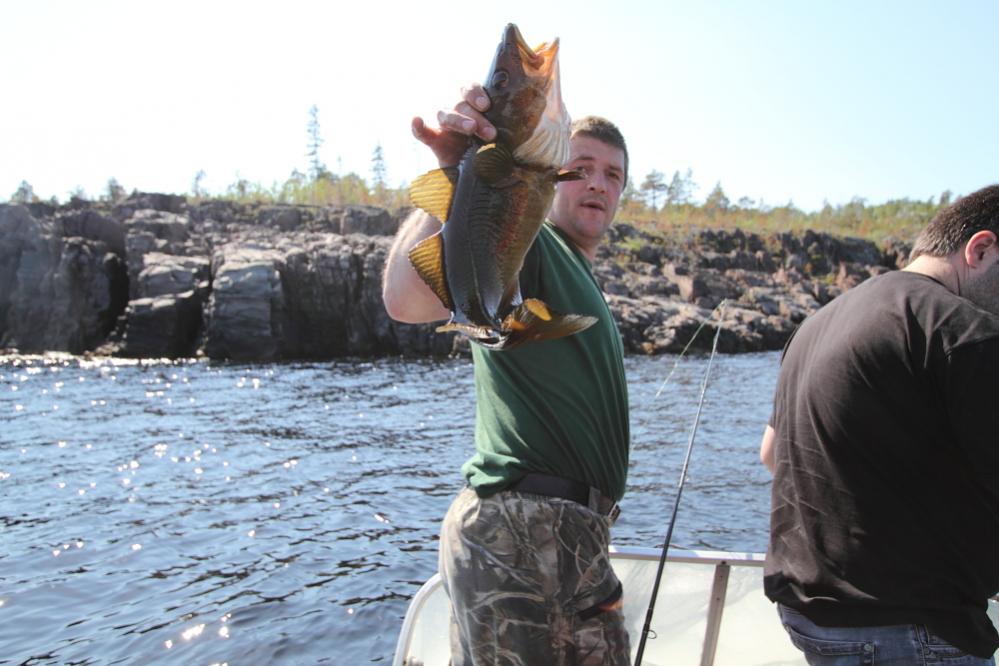 Утро началось в девять утра со стука в дверь и женского голоса: «- ребята откройте дверь, завтрак я принесла!»))))))))))) Ёпть, тут двери на замок не закрывают!!!!!!! Вообще никто! Завтрак? Какой нафик завтрак, мы не копейки еще не платили! Да пофиг, завтрак подан, скажу сразу- трехразовое питание подразумевалось как откорм нас на убой, рыба разная, каши всевозможные, первое на обед не повторилось ни разу!, мясо исключительно лосятина, оленятина, зайчатина, салаты по заказу, грибочки разнообразного приготовления, фрукты строго если и кончались то привозились сразу же!, молоко? – пожалуйста, морс из местных ягод – без ограничений! Колбаски под закусь и огурчик малосольный – строго в холодильнике! Я в шоке! Все в шоке! Вода горячая – не вопрос! Электричество – постоянно! Телевизор – спутниковая антенна без проблем! всЁ- я в раю!!!!наша задача – ловить рыбу и любоваться Карельской природой ! всЁ! больше делать не чего не надо!!! Кроме как умываться и чистить зубы))). Завтрак, и за работу – качаем лодки, разбираем шмудяк, хлопоты приятные, а душа рвется на воду, спиннинги нервно ноют запряженные на ветру у домика….ммм, красота!