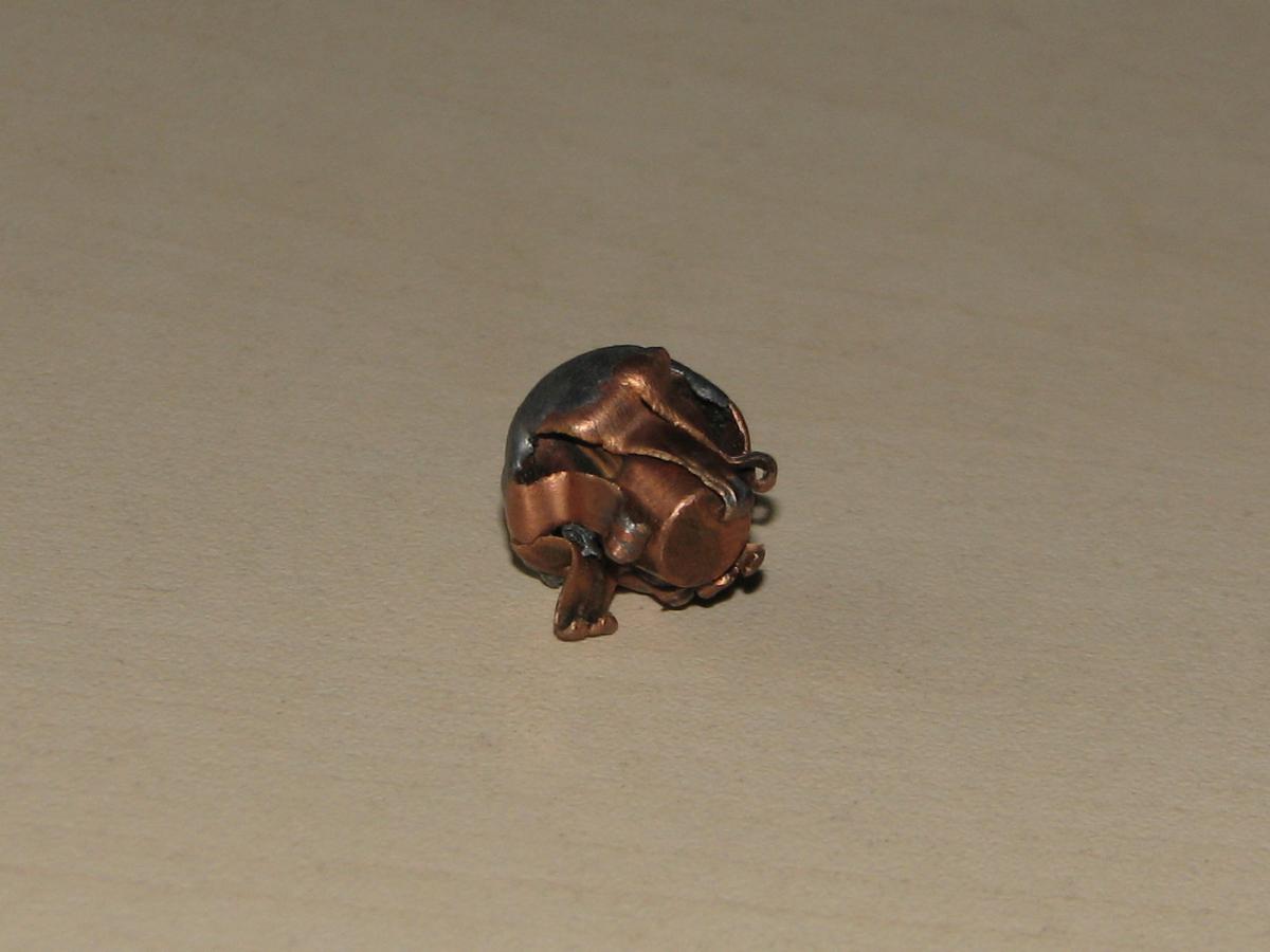 Описание действия пули после попадания: Входные отверстия - видно на фото почти рядом, первая пуля (которая под 45 град.) была найдена в задней ляшке у анального отверстия, вторая вторая сломав ребро на входе и выходе застряла в лопатке в тканях. описание внутренних повреждений - гемотома не большая, разбито одно легкое в фарш, треть печёнки отсутствовала, самое интересное - кишки не разбиты. Описание самой пули - пуля раскрылась правильным грибком.