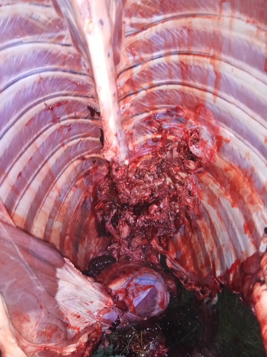 Попадание в область крестца, стрелял в полуугон. Потрошить не надо, весь кишечник на снегу. Мясо вполне съедобно и не испорчено. Оружие-карабин Сайга.
