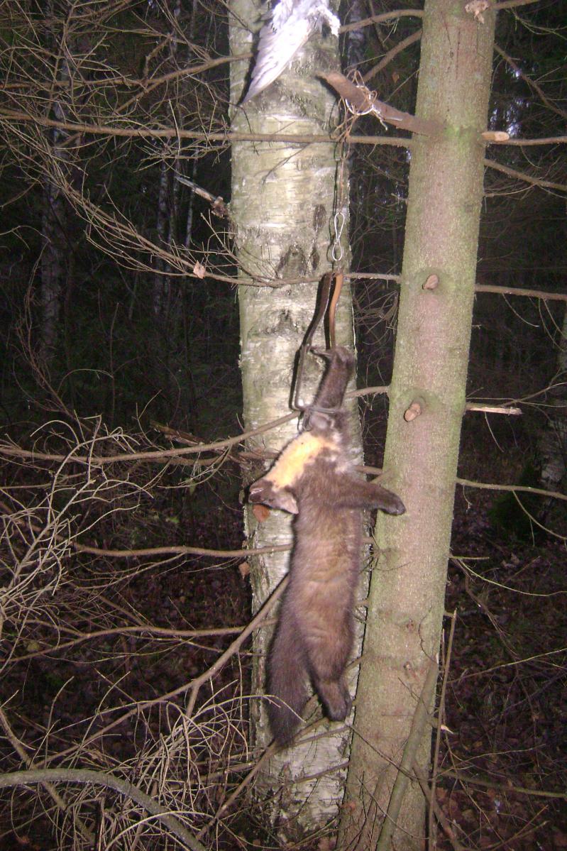 Испытанные и проверенные №1 со своими + и -. На ёлке капкан №1"Ондатра",один из минусов отваливается тарелочка и не найдёшь по чернотропу.Кот пойман за два пальца,но быстро свалился с ветки и дошёл. На ольхе видимо свалился не сразу и поэтому грыз себя,но не догрыз.Вообще не очень гуманно,но ...А ДКА ловить только ласку или горностая. ИМХО