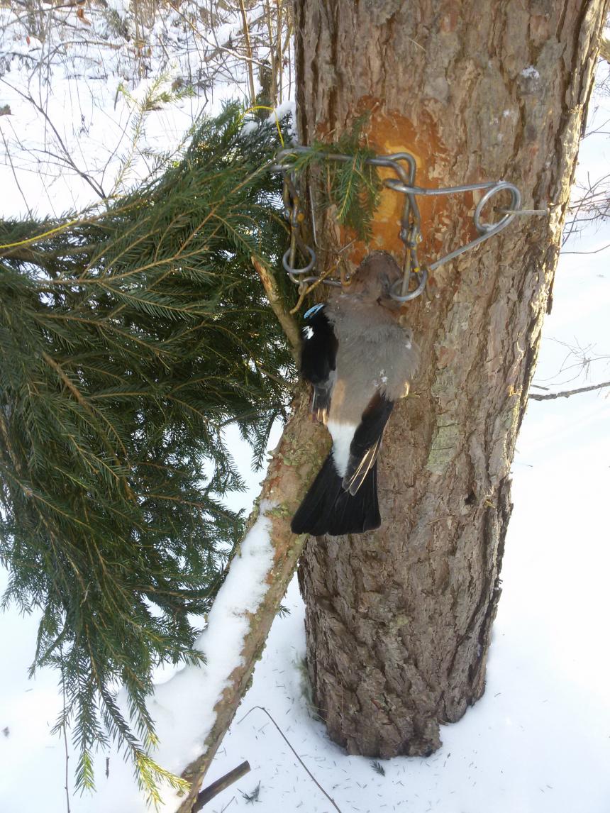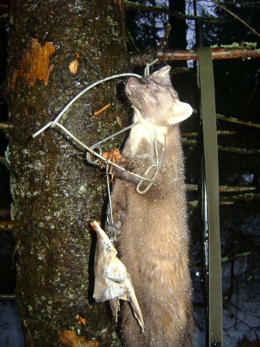 У меня стоит 12 капканов на 5 км, по два на расстоянии по 200 метров. Капканы все давящие. Пытаюсь заинтересовать куницу сойками, куриными головами и обрезками с лося. Сойки попадаются на ура:ag: