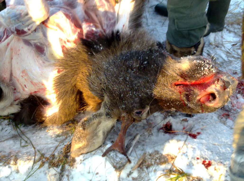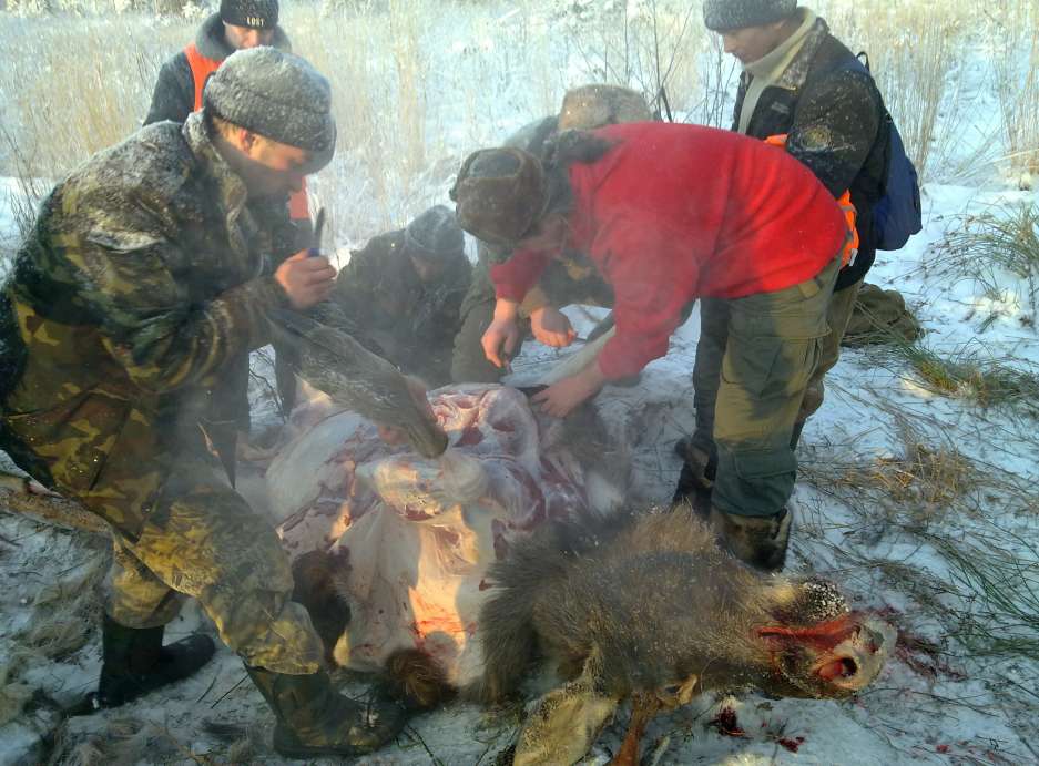 Ну я как виновник торжества начну. Надеюсь, что соучастники добавят и фотки выложат. Собрались мы на прошедшие выходные в гости в Вашуково. Изначально собирались на лосика, но посреди недели пришедшие волки подвинули местных лосей, были офлажены, и охотится предполагалось на них. Однако в субботу с утра выяснилось, что волки ночью пролезли под флажки и из оклада вышли. Было принято решение поохотится у соседей на лосика. Туда и поехали. На месте нас встретили мужики на буханке и козле и 2 лайки. Загон у них был уже обрезан, в нем стояли 2 коровы 2 телка и бык. Пошли, расставились, я стоял предпоследним справа на поле заросшем кустами. Залез на пенек, чтобы получше видно было стою жду. Бахнул выстрел, закричали, начался загон. Первые минут 10 стоял слушал собак, они молчали. Потом метров на 200 правее меня и вглубь метров на 300 подала голос лаечка, но по звуку она уходила еще правее, даже правее крайнего правого номера. Ага, подумал я, это уже хоть что то, интересно, и снял винтовку с предохранителя. Стою слушаю. Лаечка затихла. Ну блин