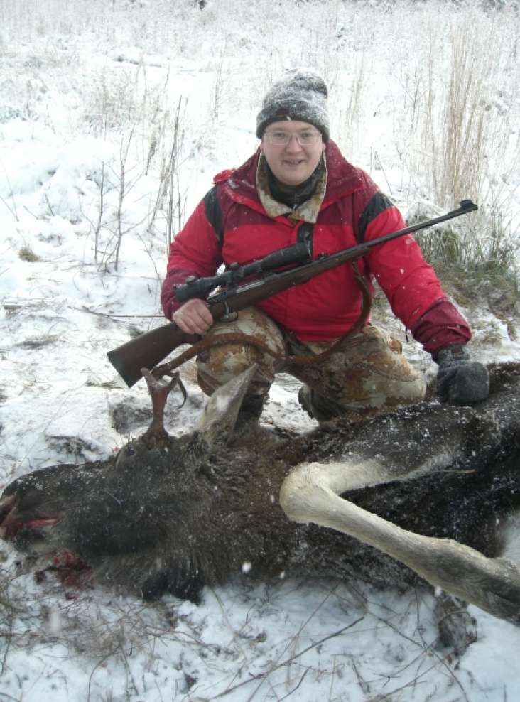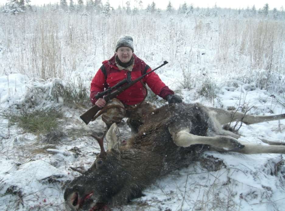 , подумал я. И прикинув по звуку направление движения вскинулся в примерную точку. Не прошло и 30-ти секунд - ОПА! Вот и лосик из за кустов выбежал! Трусцой, слева направо правее меня примерно между номерами, но следующий номер стоял чуть в низинке и видел от лосика только горб. Я провел его метров 5, успел отчетливо разглядеть (на 1.5х) небольшие рожки, выцелил и, со спокойным сердцем, нажал. Бух! Сказала девятка. Чпок! Шлепнулась пуля. Пыххх! Бычок упал не сделав и шагу. Ноги к верху и задергался в конвульсиях. Перезаряжаюсь. Тут же подбежала лаечка и начала его драть. Я поменял кратность на 6х и стою целюсь. Одна мысль "ну только попробуй встать"! Но уже через минутку понял, все, не встанет. (Расстояние потом прикинули - 80м примерно, попал в позвоночник, пуля разбила позвонок, ушла ниже, пробила верх легкого сломала ребро и улетела. Стрелял Norma Oryx 21,1г.). Дальше тихая бурная радость. До конца загона стоял на пеньке и трофей в прицел разглядывал