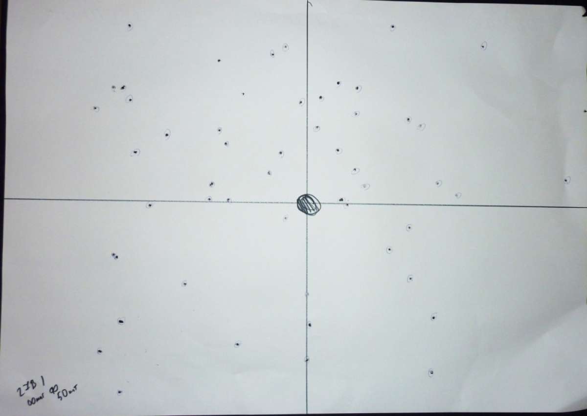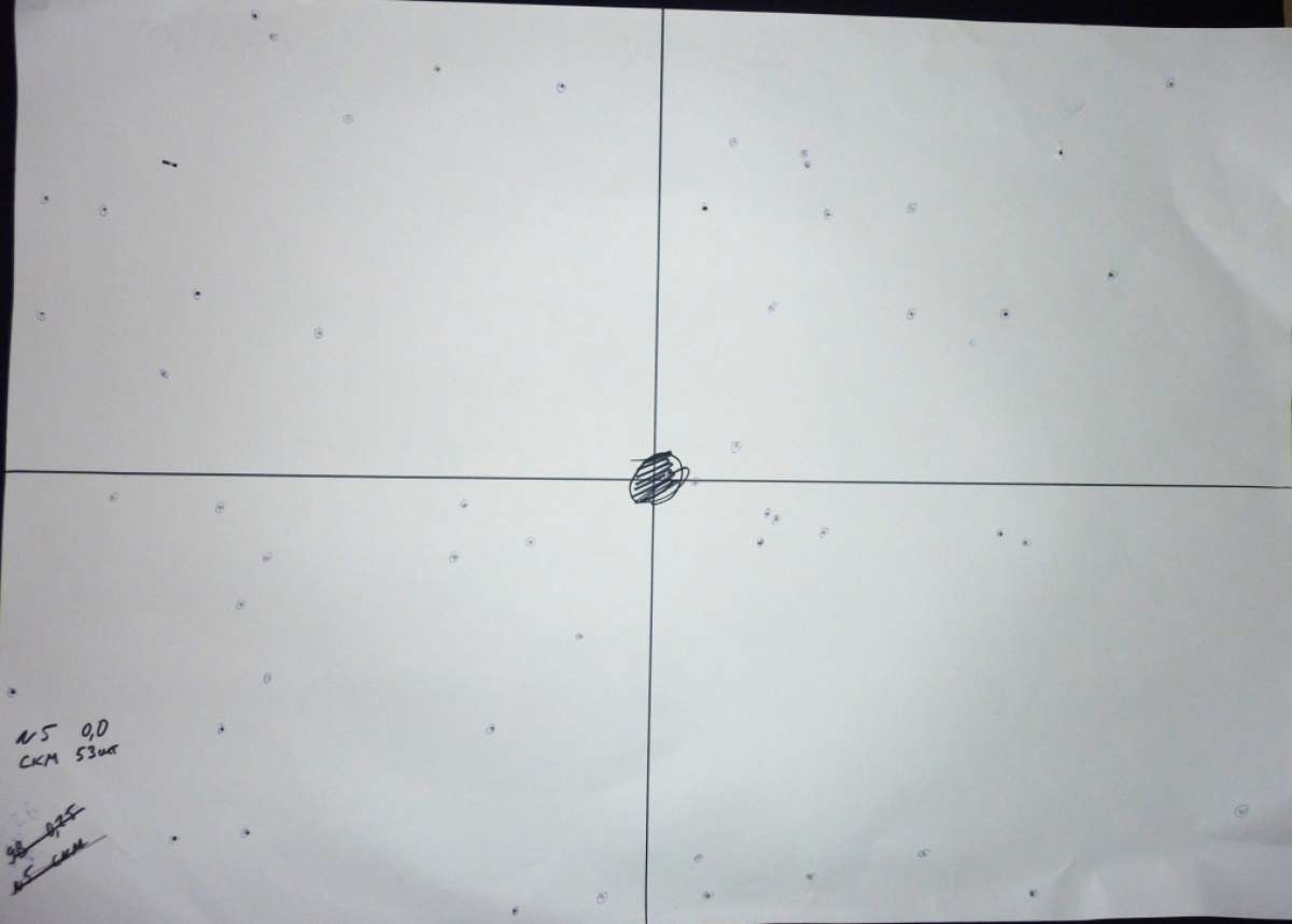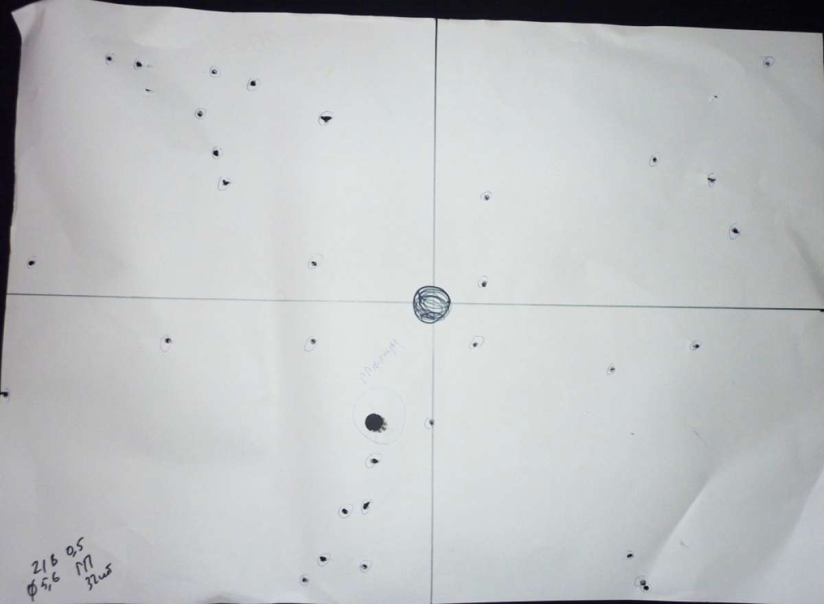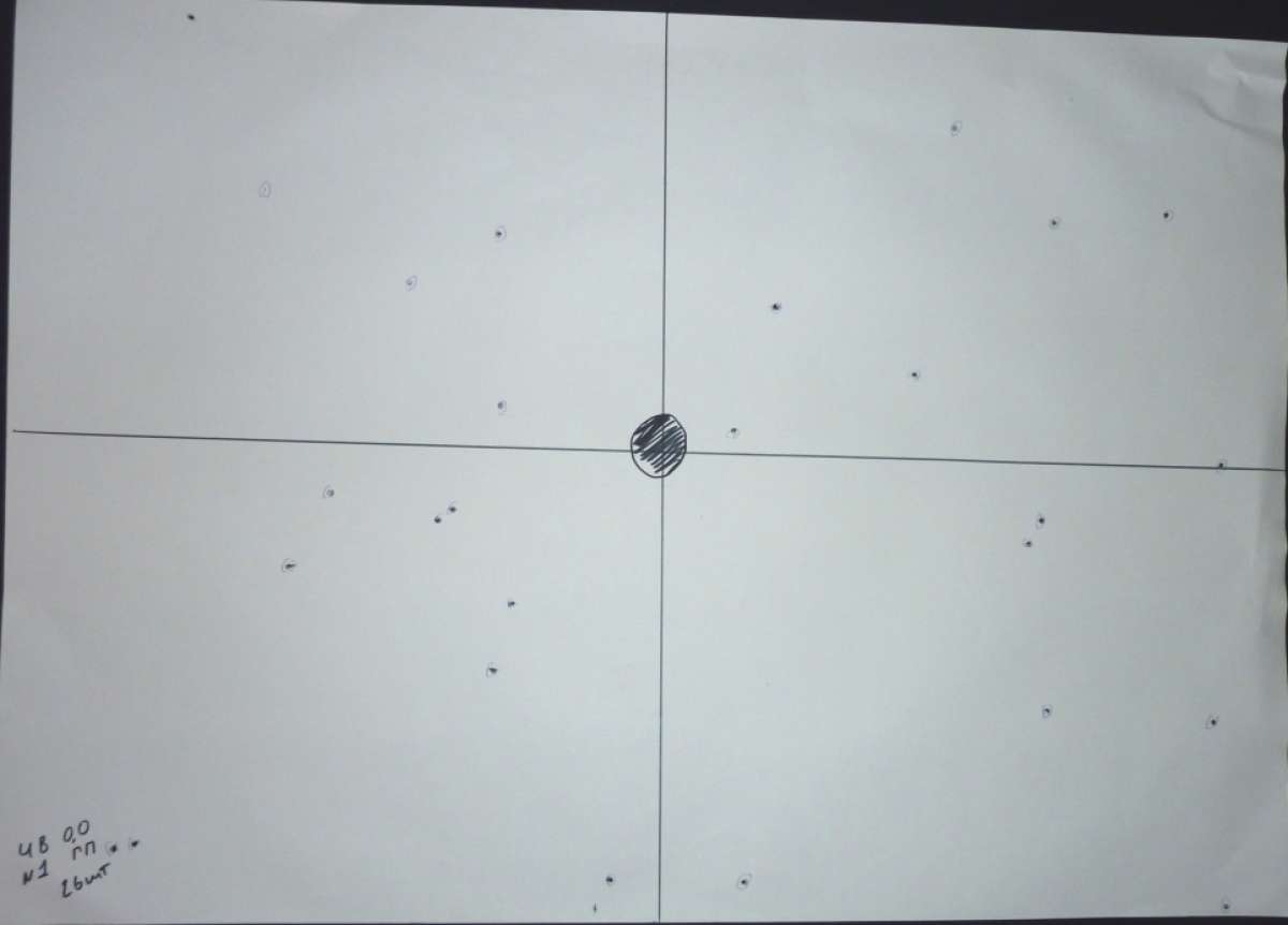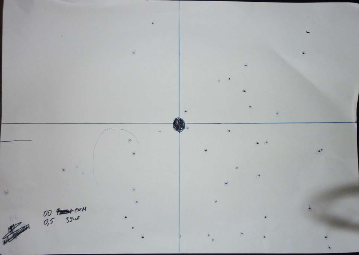 У Карена, к сожалению, неправильно наложена сама 100-дольная мишень на листы. Центр осыпи не нащупан. Наверное, Карен, Вы сначала мишень нарисовали, а потом стреляли по ней?