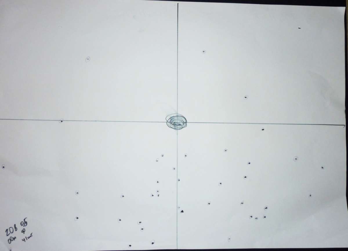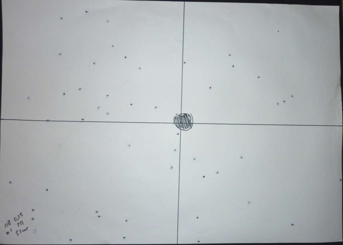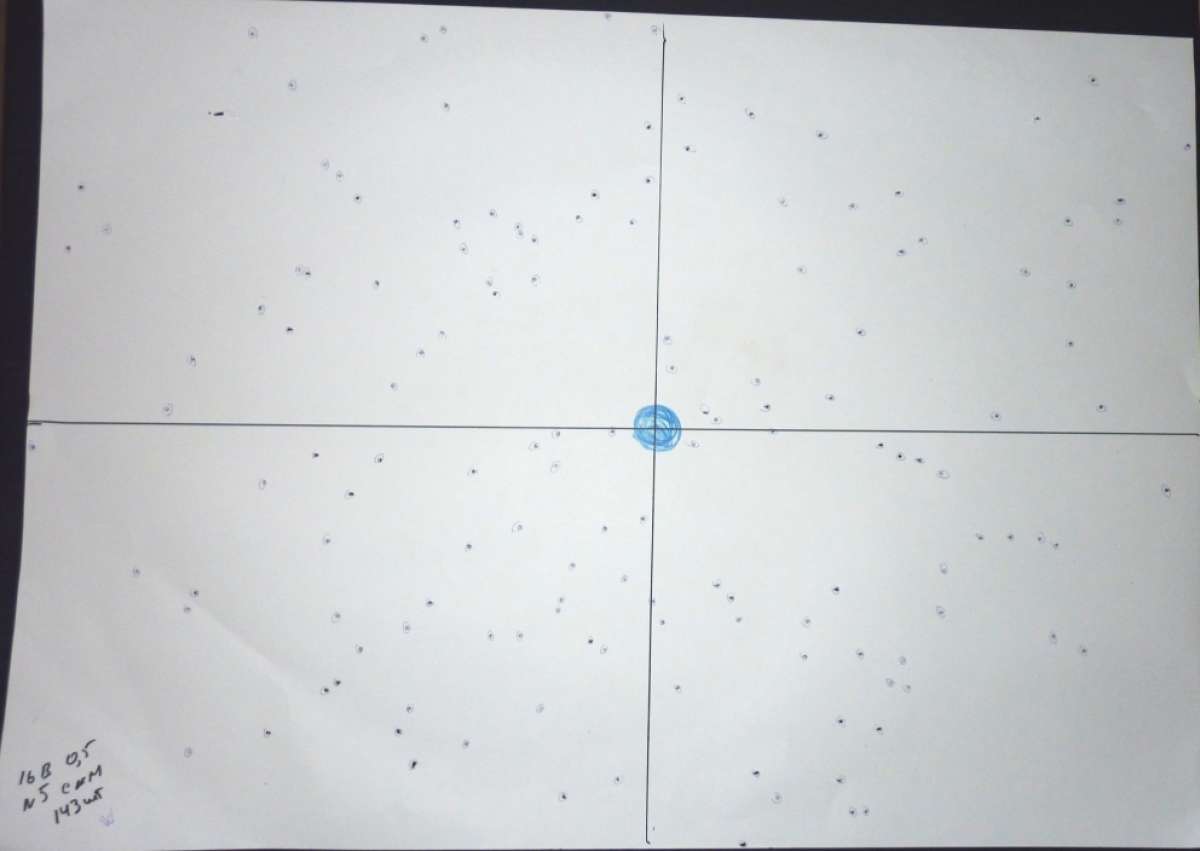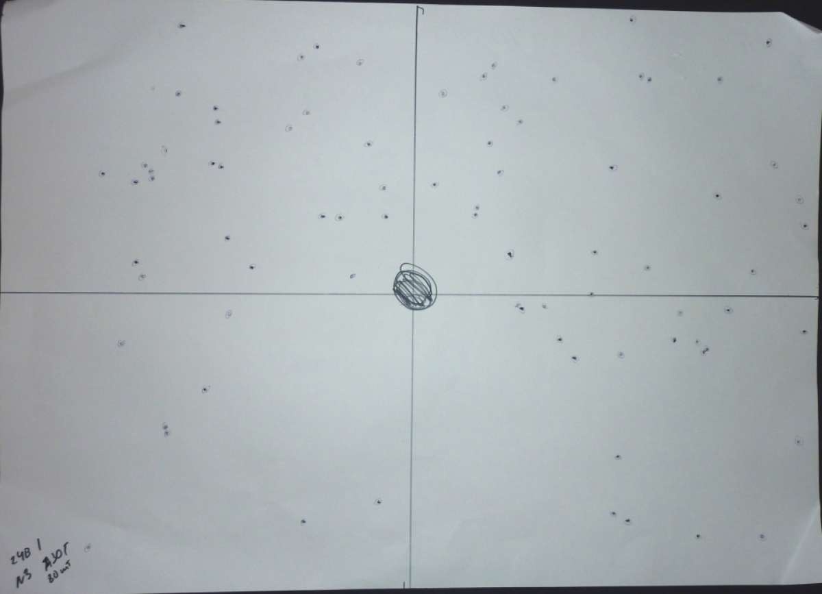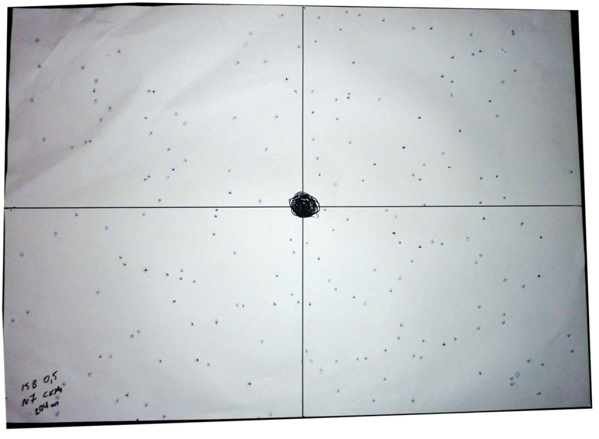 У Карена, к сожалению, неправильно наложена сама 100-дольная мишень на листы. Центр осыпи не нащупан. Наверное, Карен, Вы сначала мишень нарисовали, а потом стреляли по ней?