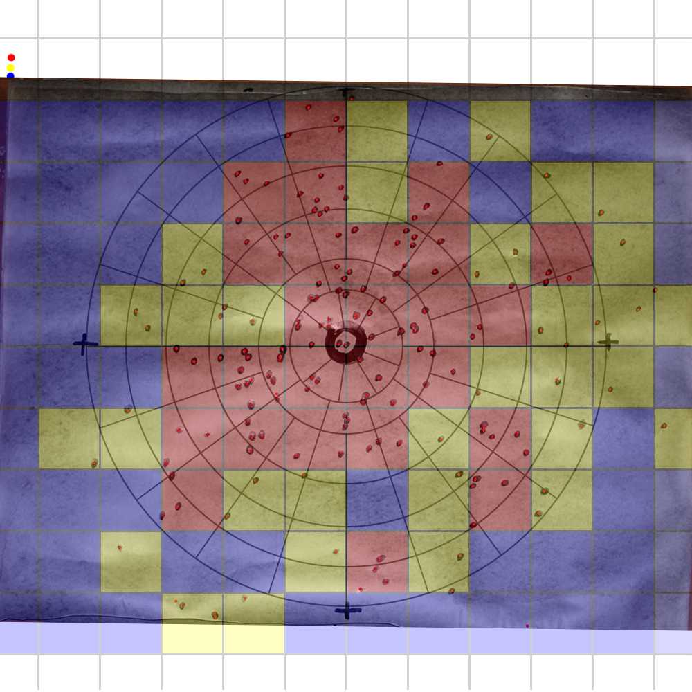 Вы не совсем верно производите оценку равномерности. Из-за применённого укучнителя на этом расстоянии, с какого вы производили стрельбу, получилось повышенное сгущение к центру. Для чока на 35м оно должно быть в пределах 3,0. Если вы отойдёте на большее расстояние, то сгущение уменьшится и увеличится равномерность. Просто этот патрон рассчитан на большее расстояние для применения и оценки. Если же вам необходимо именно это расстояние, то немного, порядка на 0,05г увеличьте навеску пороха. Осыпь станет менее кучной, но более равномерной. Конечно, на 35м такая кучность не нужна. Будут промахи.