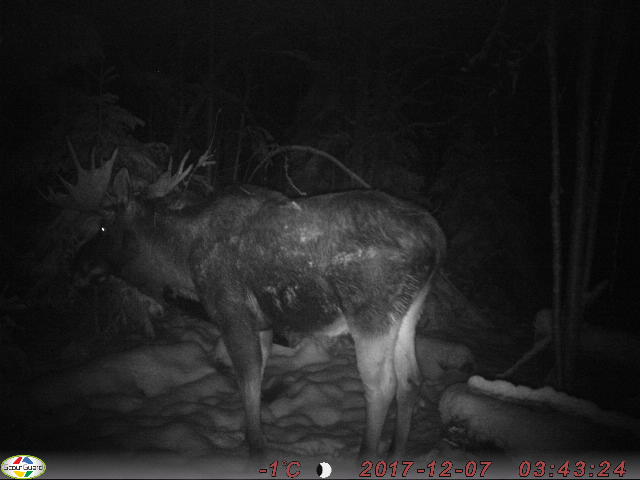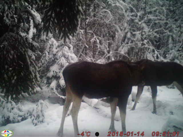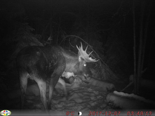 На солонцы иногда выходят мишки, но чаще к кормушкам ходят. Лосей много. Вон какой бык зимой ходил: