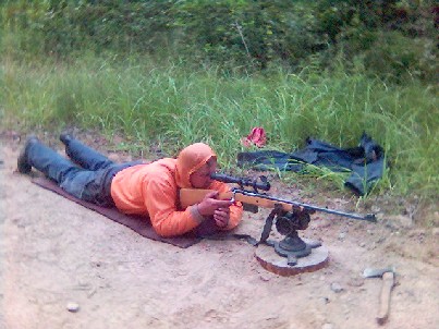 пристреливаю свой карабин со станка,затем произвожу несколько выстрелов с мешочка,сидя с колен,стоя без всякого упора.