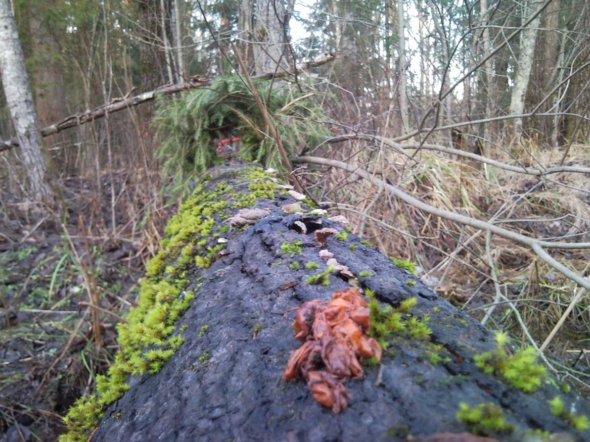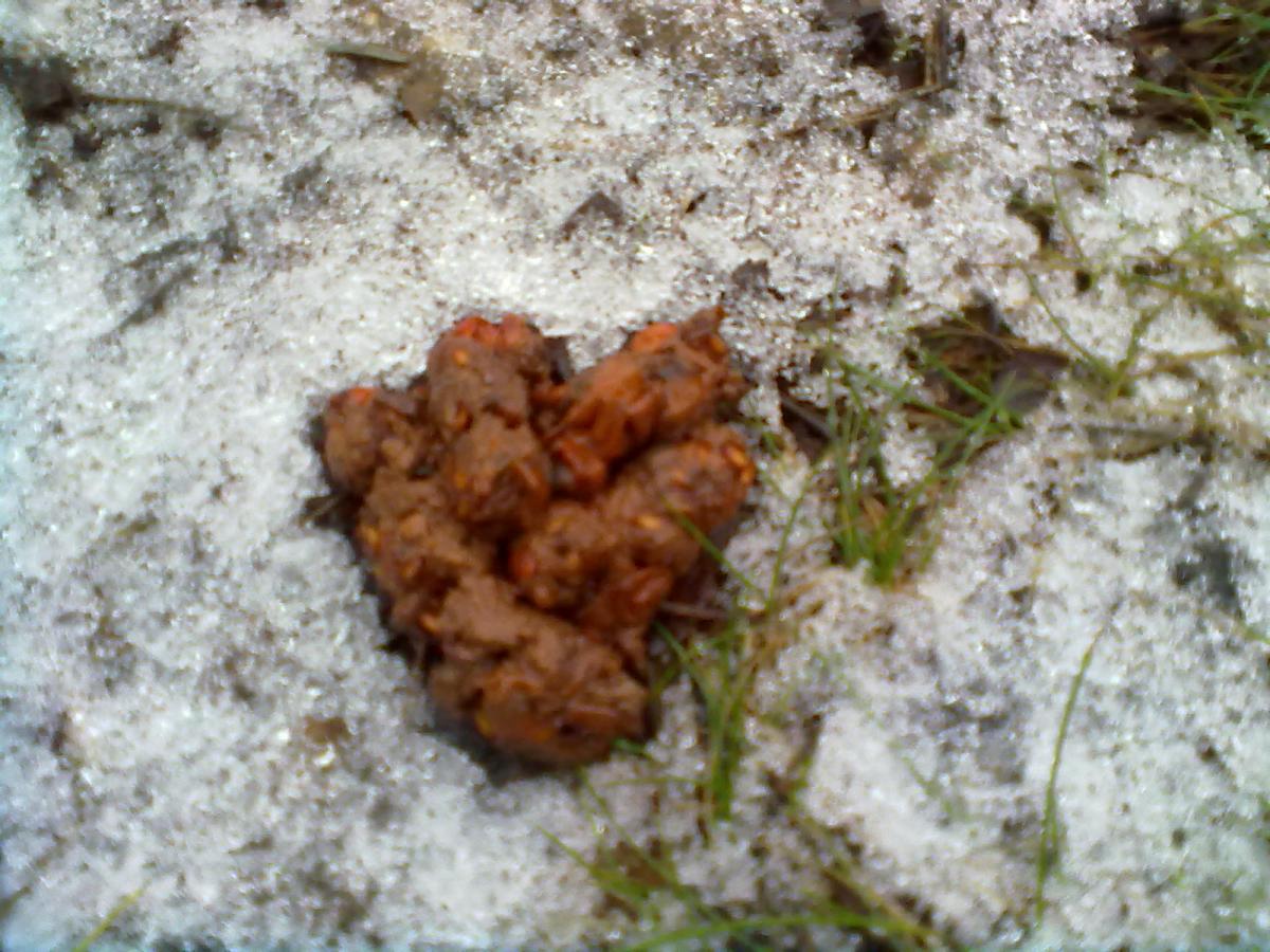 Думал, что за балбес **** в одном и том же месте, на дереве, лежащем поперек... охотничьей тропинки. Фотку сделал в тот день, когда мне кот попался. Немного не понял. Тут оранжевое, видать, рябину ел. Под хвостом же у попавшегося мне было черное и жидкое. Я так и думал, что у них помет черный и жидкий.