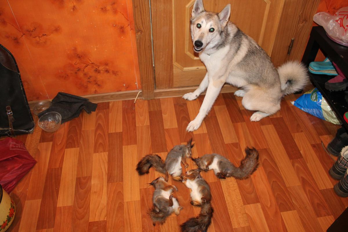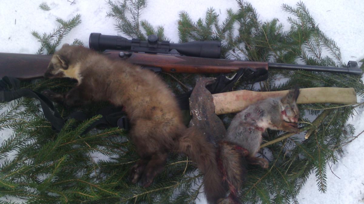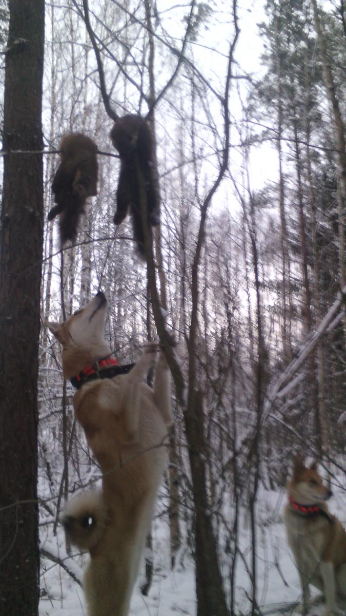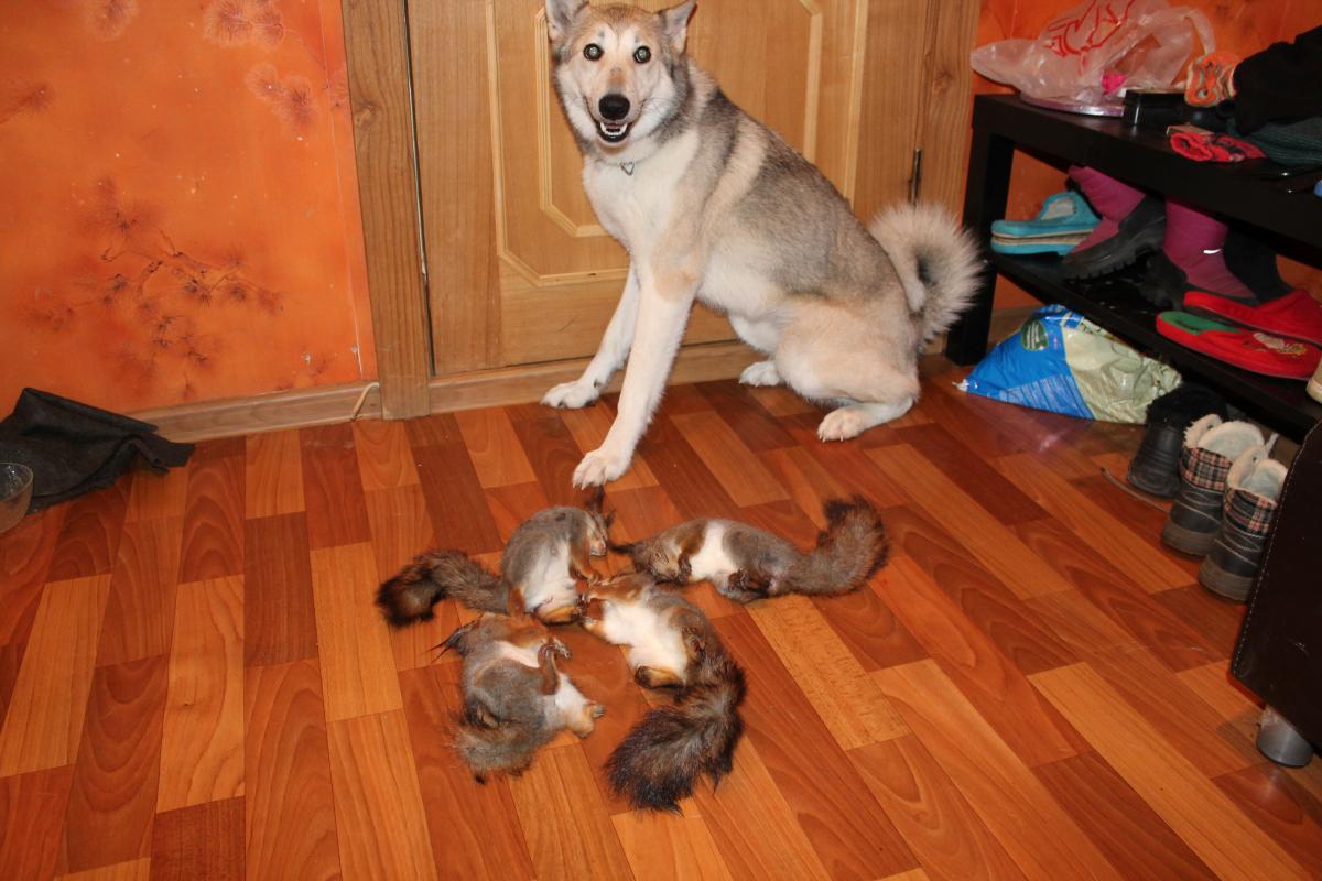 На фото карабин, а белка как после дробового, собака треплет? а так молодцы!!!