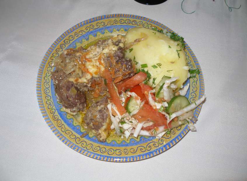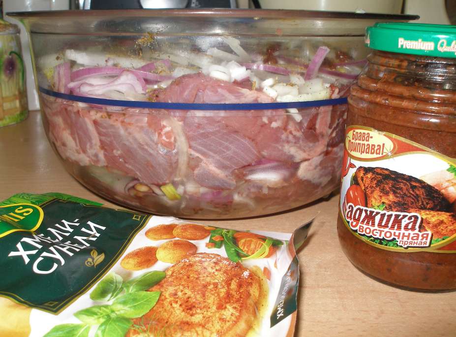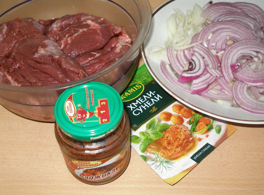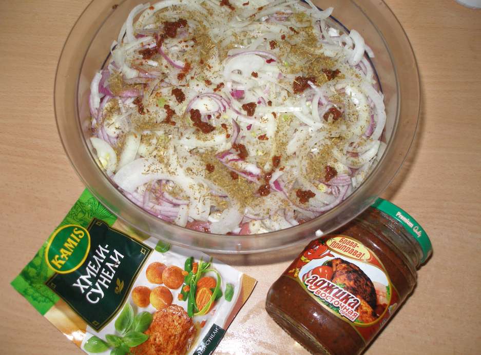 Лук со специями, аджичка(немного) + Мяско