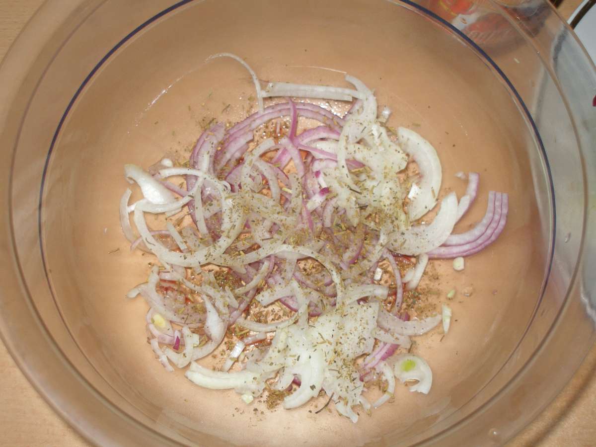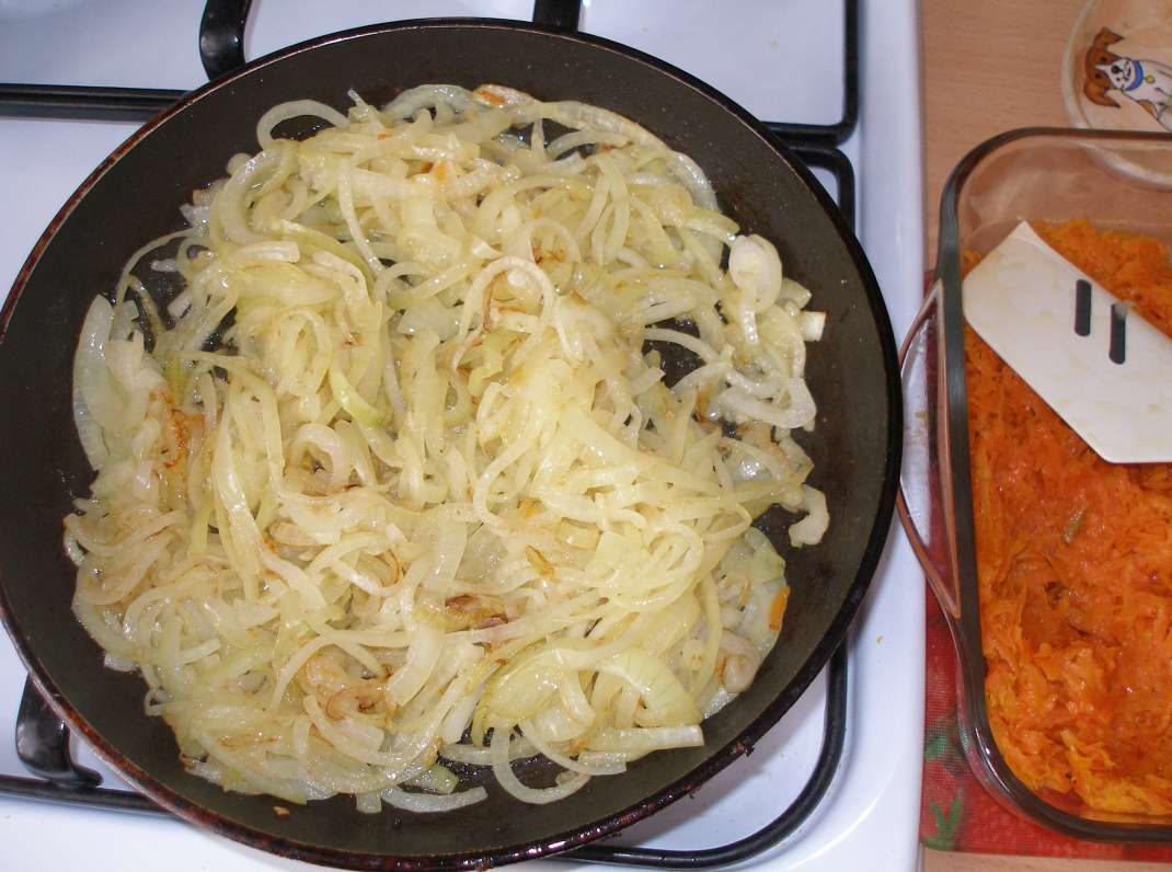 Берем снова лук , режем кольцами и обжариваем.