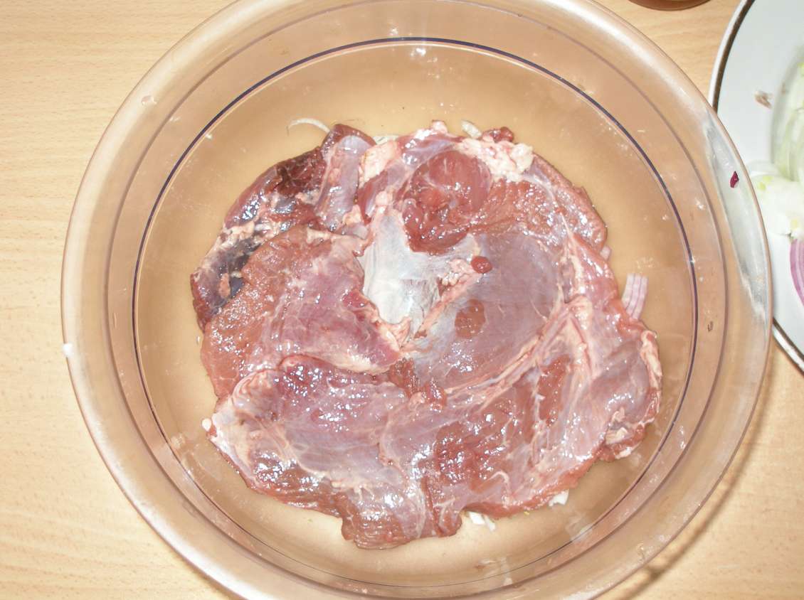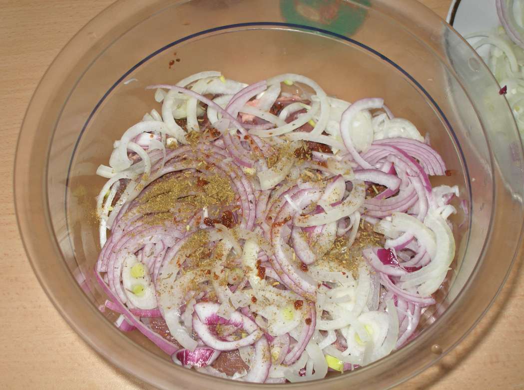 Снова Слой мяса+соль+специи(немного), слой лука (что мариновался с мяском)