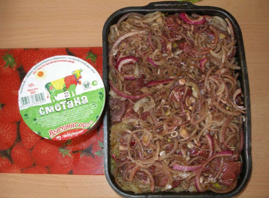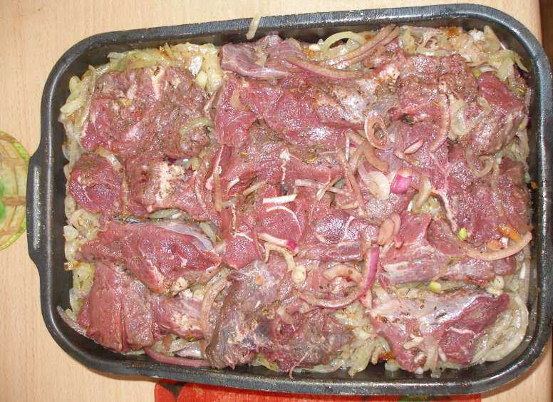 Слой мяса+соль+специи(немного), слой лука жаренного