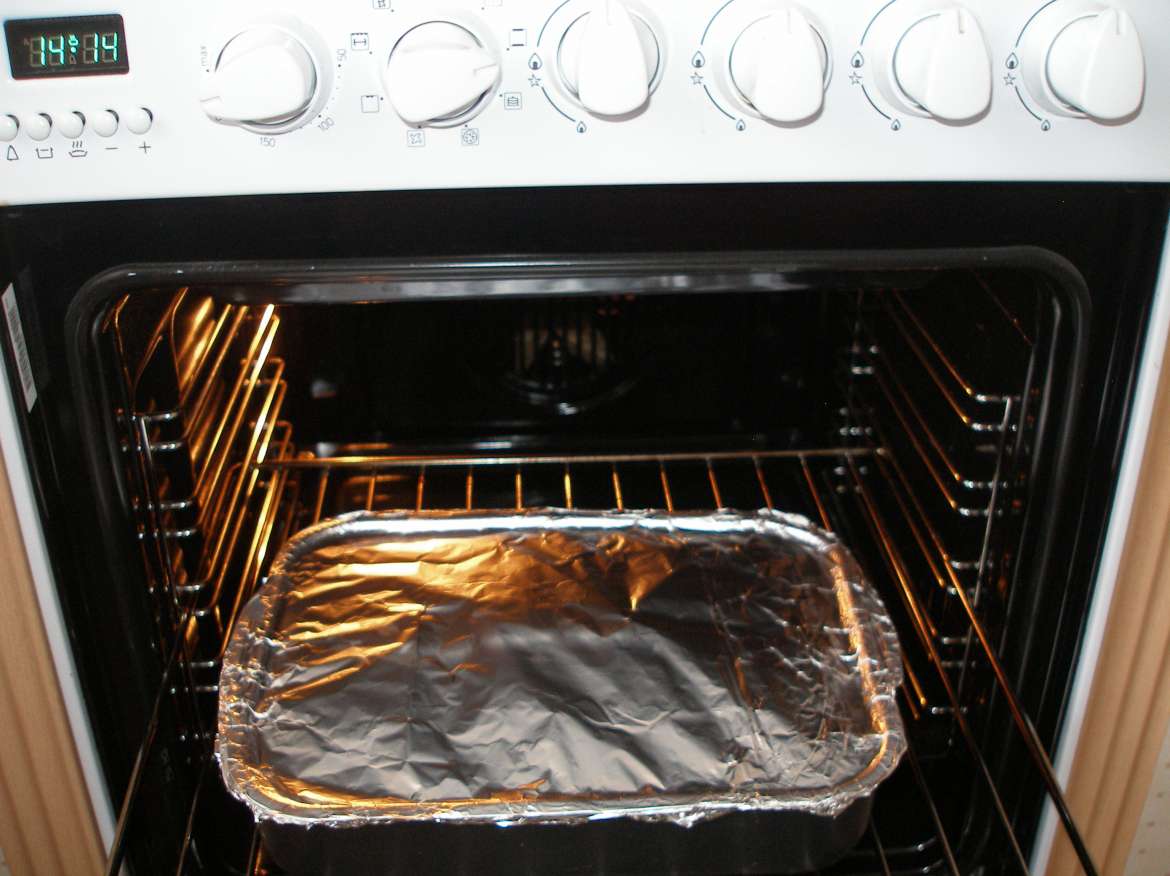 Т.е. за 10 минут до готовности продукт освобождаем от фольги, покрываем его тертым сыром и снова в печь.(Отбиваясь от всё тех же страждущих расправы)