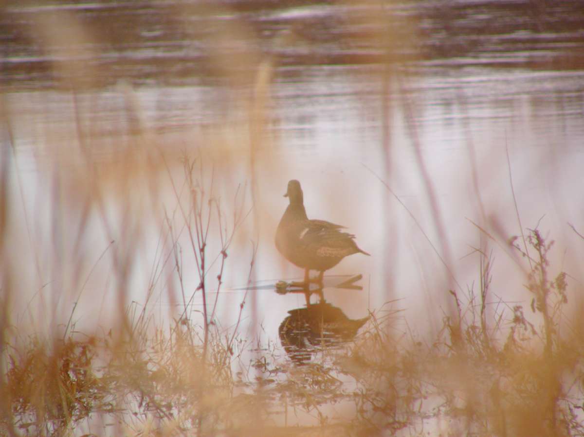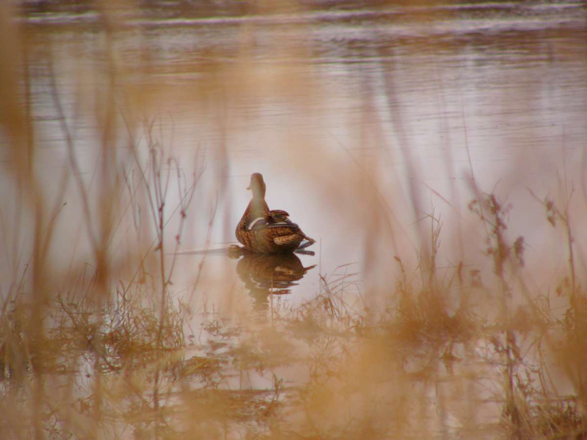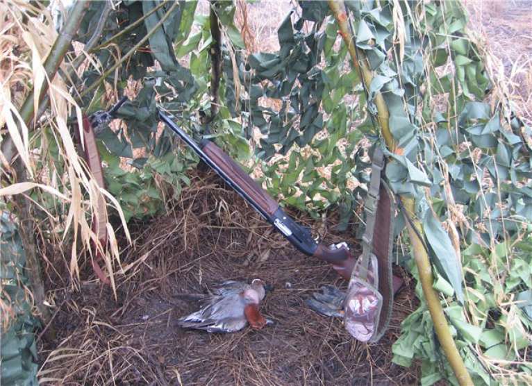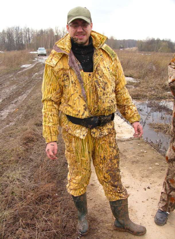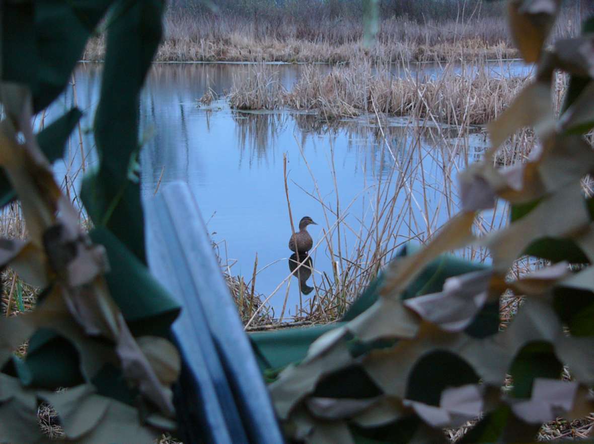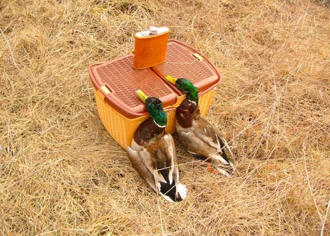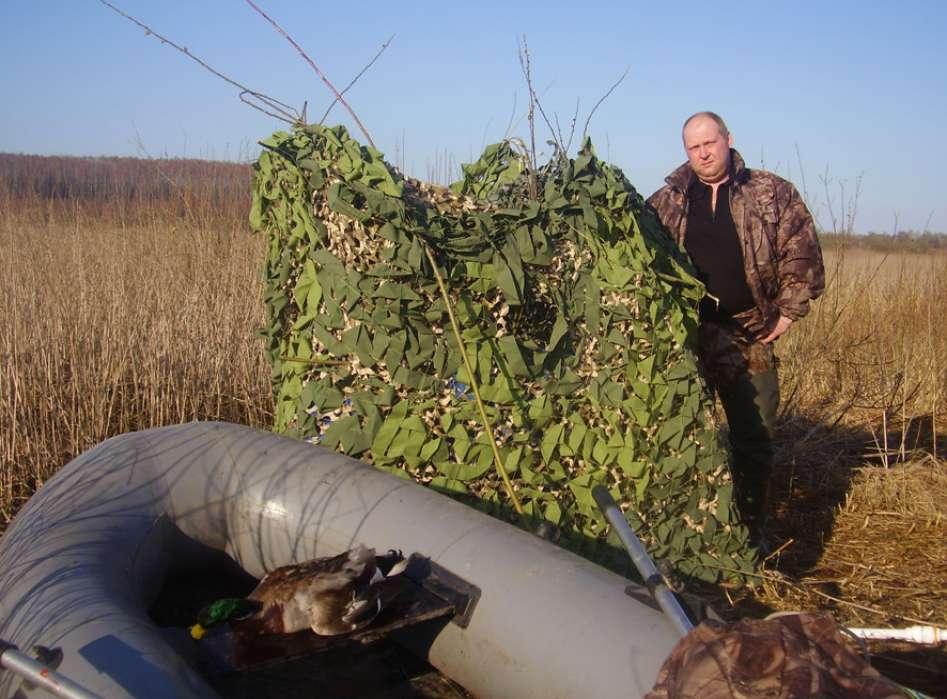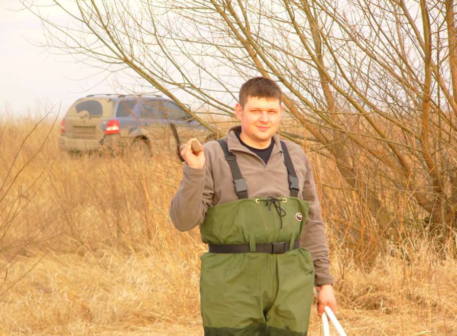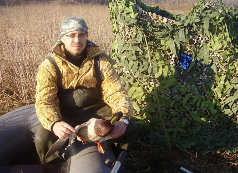 Утром, оставив машину подальше от болота, тащим на себе все борохло на болото. И тут, Паша (шедший впереди), так тихо-тихо говорит: « у меня под ногами сидит селезень». Ну как можно в такое поверить? Но сидит.. и не улетает!!!! Как оказалось, это пятничный подранок, вылез на тропинку и дошел…. (потом оказалось, что в нем четыре дробины!!! Как он прожил столько времени, непонятно). Вот так утро, мы еще не дошли до шалаша, а уже с трофеем. Посадив Пашкину подсадную, я отправился сажать свою. Очень скоро, к ней собрался подсесть селезень….но передумал. Уходящего, я смазал. Сижу себе, отдыхаю….подсадную видно не очень хорошо из-за кочек….но видно. Но ее не слышно, что то надолго она замолчала после выстрела….непорядок. Понимаюсь, присматриваюсь…. а ее нету, теперь я потерял подсадную. Что то много я теряю, за эту поездку, прямо растяпа. Вот и конец охоте, точнее конец охоте на селезня…и начало охоты на подсадную. Я осваивал умение римских гладиаторов метать «боевую сеть», правда как человек современный, усложнил задачу….метая ее с лодки. В общем зашугали мы утку, так что она заныкалась и затаилась. Паша предложил высодить на эту протоку его утку…дабы подманила подружку. Так и сделали и пошли доставать его селезня и собирать барахло. И «освободившаяся утка» приплыла….и была таки поймана в сети, Паша потом еле распутал нашу «путешественницу». Естественно, на этом охота была законченна….и мы двинулись к машине. Я с барохлом на лодке, а Паша пешком встречать меня у машины. В процессе эвакуации, Паша опять искупался (видать водичка понравилась)….я хотел было запечатлеть процесс утреннего мужского стриптиза…но в виду явного Пашиного весового преимущества, признал эту идею неперспективной. Вернувшись на базу…я обнаружил отсутствие ножа…покумекав, пришел к выводу, что он скорее всего вылетел из ножен, когда я «висел на ветках» в попытках найти раненного валика. Нож, пополнил «список потеряшки». Одолжив у егеря Ниву, поехал на место вчерашней охоты и что удивительно….среди прошлогодней травы и листвы, нашел его. Вернувшись на базу, разделал селезня, вымыл руки и нож…и пошел собираться в дорогу.