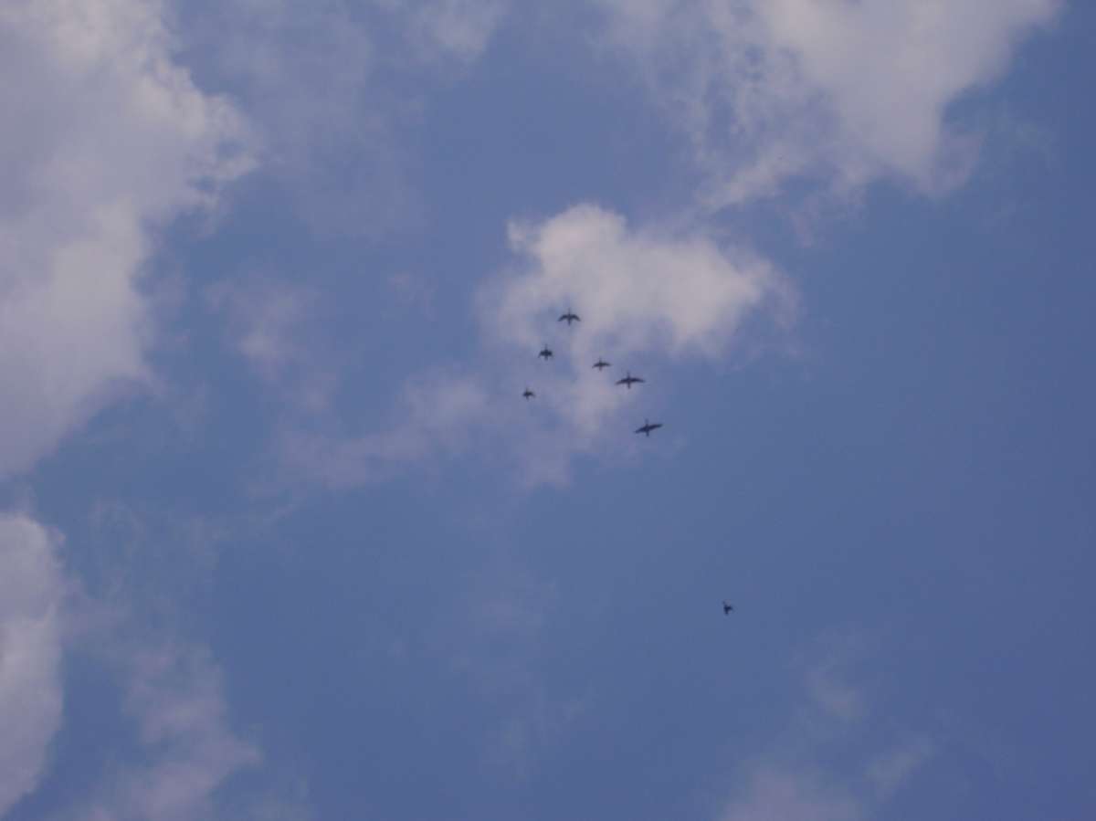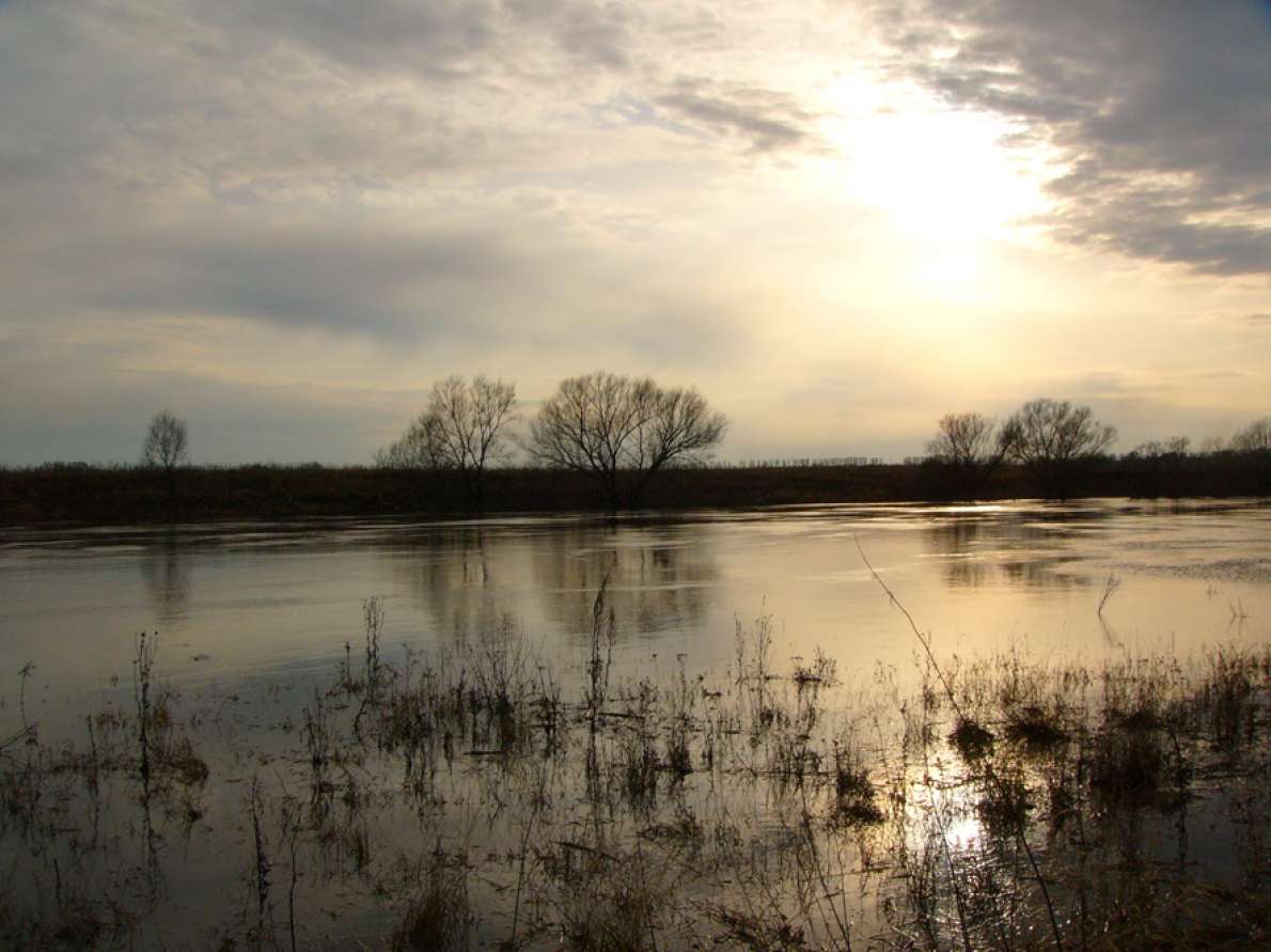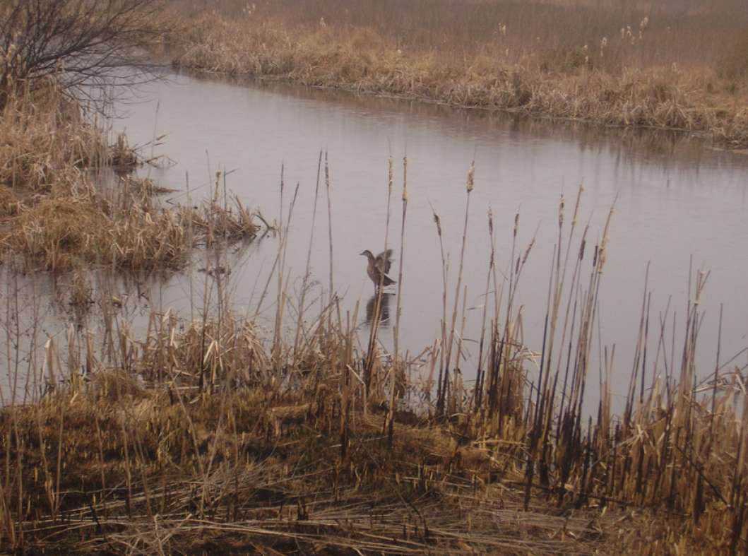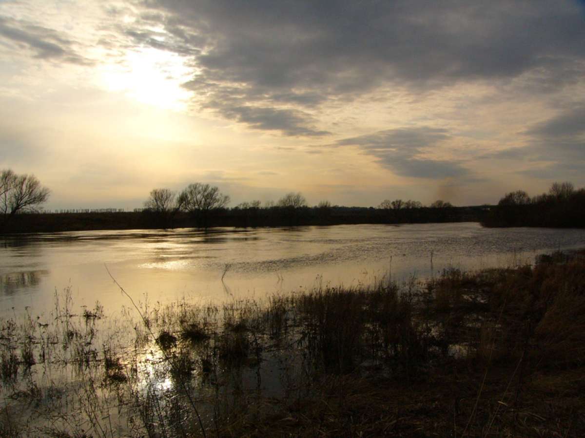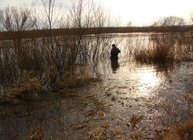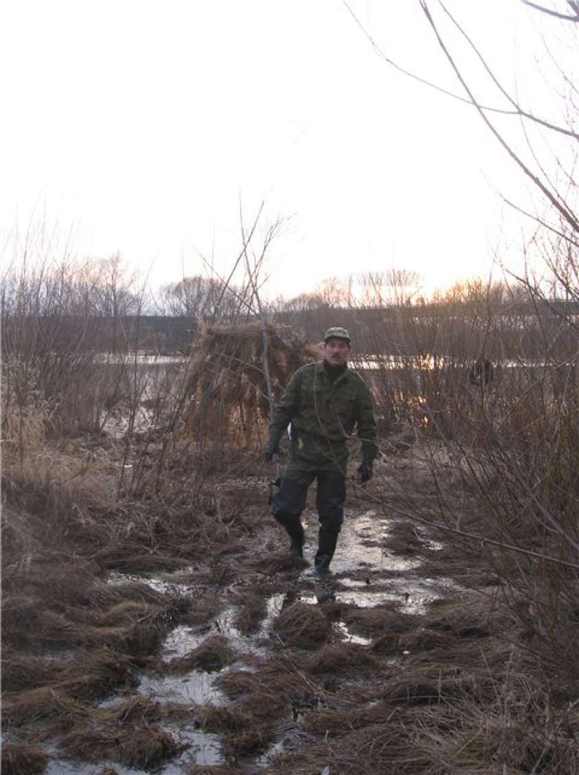 Расположившись у Афанасича в гостях, отправились посмотреть на угодия. Ока, сразу отпала… вода полностью сошла до русла… метров шесть ушло, относительно нашего предыдущего визита (на одной из фотографий, Паша стоит у речки рядом с деревом, так две недели назад, из воды были видны только верхние его ветки). А вот небольшие болотца после поворота на Орел, порадовали присутствием утиной братии. Правда, одно из них уже было обжито шалашами охотников (как в последствии оказалось не кинутыми, а активно используемыми). А вот, на втором болотце, оказался только знакомый нам по прошлому разу разборный шалаш, мужика с которым мы уже были знакомы. Решили там и обосноваться. Тем более, что исследуя местность, мы подняли достаточно много дичи. И даже во время постройки укрытий, периодически прибывала утиная братия, с целью приземлиться. Хотя болотина и небольшая…но активно посещаемая утиным семейством.