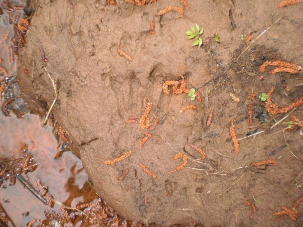 Серёжки на глине - ольховые. Какой размер ольховой серёжки? (Надо у Галины спросить при случае)). Примерно 5 см. Значит размер следа не менее 12 см. Какая же это ондатра то? У неё размер следочка соразмерный с этими серёжками будет, а здесь вона какой следище.