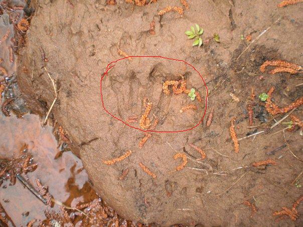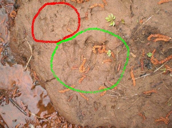 Правильно понимаю: на фото два отпечатка, обведенных красным, размер - примерно сантиметров 7, судя по березовым сережкам?