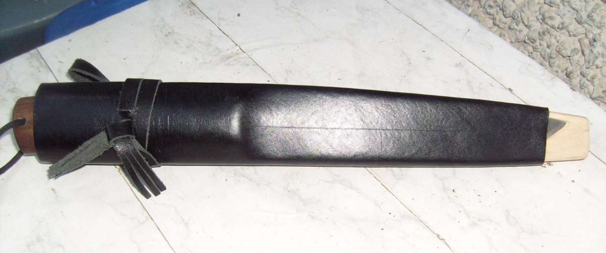 Вот ещё в национальном стиле ножи.Сталь 9ХС которая,по моему мнению, лучше остальных обладает режушими свойствами.И ещё получился хамон,который хорошо заметен.Ручка берёзовая капа.Ножны чисто в национальном стиле.В современном варианте нижнюю часть не оголяют,так проще.Забыл дописать про петлю которая делается в конце рукоятки.В эту петлю продеватся мизинец и рука при работе не соскальзывает вперёд,предохраняя от пореза.С ув.Стас.