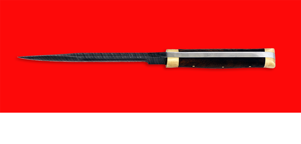 1. Нож цельнометаллический, рукоять темный орех, гарда и задняя часть рукояти из латуни. На рукояти в конце дырка под шнурок. Общая длина 280 мм. Длина клинка 170 мм. Ширина клинка 27 мм. Толщина клинка 6 мм. Длина рукоятки 110 мм.