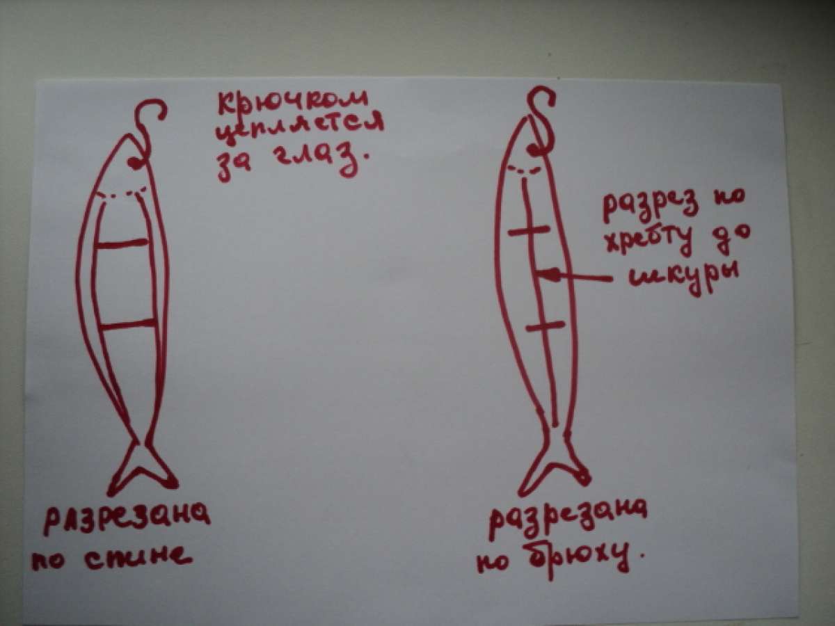 Если рыба порезана на пласт, при вялении, копчении необходимо поперёк тушки вставить палочки, которые не дадут рыбе сложится. Если не завышать температуру дыма, рыба с крючков не упадёт.