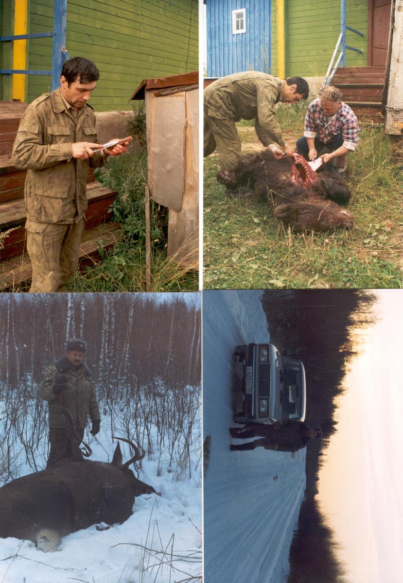 Осторожно подошли к участку посевов, наиболее посещаемых зверями. По доносившимся звукам из посевов стало ясно, что в поле кормится семья. Короткое глухое периодическое взрыкивание главной свиньи, иногда взвизги поросят, чмоканье и чавканье с разных направлений показывало, что стадо довольно большое. С бугорка, продвигаясь за кормящимися зверями, пытаюсь в 34-й что-то высмотреть в посевах - бесполезно, слишком они высоки, да еще довольно много бурьяна. Оборачиваюсь, смотрю в обратную сторону по границе посева и скошенного поля травы - КАБАН! Зверь вышел из посевов на скошенную траву, немного постоял, развернулся, сунул голову в посев и начал что-то выбирать. Замечаю, что рядом вышел еще зверь, затем ещё один. Все разного размера - первый, по всем признакам, секач, самый крупный. Подсоединяем прицел к ИЖ-18, протягиваю оружие товарищу - иди. Тот замотал головой - у меня не получиться, я не смогу подойти, у тебя получается сподручнее - в общем, товарищ явно чувствовал, что не сможет успешно завершить дело. В то же время зная, что приклад ружья товарищ подогнал под себя (мне он короток и при выстреле отдачей прицелом разбивает в кровь переносицу), выверку прицела и его пристрелку он делал сам (я затем лишь по его двум попаданиям в мишень и количеству сделанных им щелчков винта выверки (не в ту сторону) лишь подкорректировал в необходимую сторону прицельную марку, я для вида так же немного попротивился, но затем взял оружие и пошел вперед. В поле зрения остался лишь один зверь, два других зашли в посев и стали не видимы. Затем и последний зверь ушел в посев и исчез с поля зрения. Быстро согнувшись, но осторожно, без шума двигаюсь вдоль поля. Совсем рядом доносится шуршание, тихий треск и смачное чавканье кормящегося зверя. Привстаю - смотрю в направлении звука. Далекий свет уличного освещения поселка засвечивает поле зрения прицела - ничего не видно. Пригнувшись почти до земли снова продвигаюсь вперед. Сняв ружьё с предохранителя, включив прицельную марку и изготовившись для выстрела - медленно привстаю и ищу зверя. Звуков кормежки не слышно, лишь тихий стрекот работающего прицела. Вожу вправо-влево по посеву и вдруг совершенно неожиданно для себя вижу в поле зрения темную часть лба зверя с двумя торчащими ушами. По расстоянию между ушами я понимаю, что зверь совсем близко и он услышал, а скорее всего, увидел меня, т.к. зверь стоит в посеве неподвижно и рассматривает непонятно откуда взявшийся перед ним темный столб, прислушивается. Понимая, что другого шанса выстрелить у меня уже не будет, дожидаться, что зверь повернется и подставит мне свою лопатку - не реально в этих условиях, я навожу прицельную марку прицела между торчащими ушами, опускаю её вниз в посев в район предполагаемой груди зверя, отвожу голову от окуляра (дабы отдачей не разбить лицо) и нажимаю на курок. Отдачи оружия, да и звука выстрела, почти не было. Не сильный хлопок выстрела, короткий не то взвизг, не то взрев, треск удаляющихся зверей. Я открытым зрением вижу две скачущие по посевам темные фигуры зверей. То, что попал, у меня сомнений не было, т.к. зверь не визжит просто так. Но как попал? И найдем ли мы зверя. Пучком вырванных посевов замечаю место, возвращаюсь к медленно двигавшемуся за мной товарищу. Тот по жизни пессимист - и в этот раз говорит, что я не попал, т.к. он не слышал шлепка пу