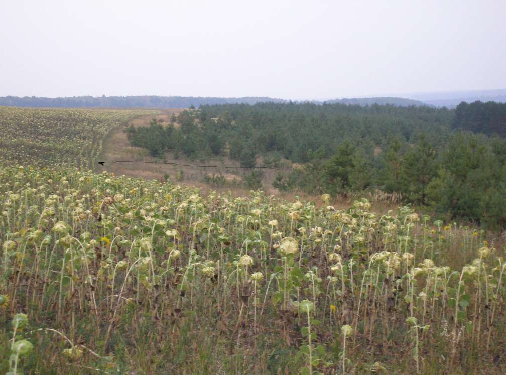 Вдоль леса, где он явно дневает, простирается кривая сельская дорожка - далее лес шириной около 500 метров и поля, поля полные зерна.
