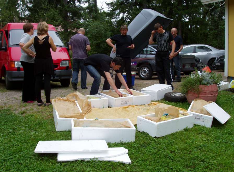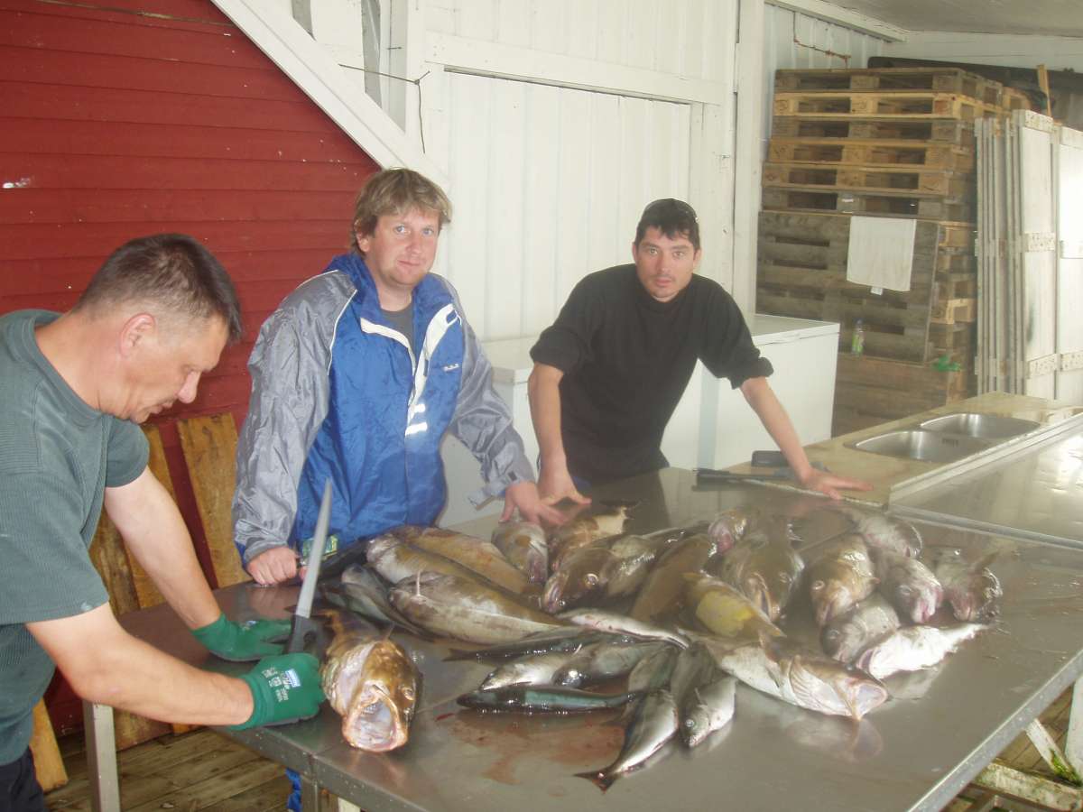 Т.к. скорость движения с прицепом ограничена до 80 км/ч, то весь путь 1350 км поделили по 200км на каждого. Дорога с перекурами-пописами-перекусами заняла 25 часов. Переночевав в Иматре, с богом помолясь отправились в путь. В 110 км от старта наблюдали последствия урагана. Не слабее чем на Ладоге. В Швецию въезжали поздним вечером, но пересечение полярного круга не пропустили. Ранним утром - Норвегия. 200 км узкой извилистой дороги по берегу фьёрдов и мы на месте. Поразила вода - на глубине до 7м изумительно лазурная и везде жутко солёная. Местные жители были приветливо равнодушны. Приезд, заселение, отмечание пропускаем. Первый же выход в море принёс ожидаемые результаты. Минёк, сайда, треска, люр. Режим дня выбрали такой: завтрак-рыбалка-обед-тихий час-рыбалка-ужин- отбой. Соседи шведы и датчане уходили на воду утром и возвращались вечером. Но мы решили, что мы не на мясозаготовках. Правда и улов был у них побогаче - треска до 22 кг, камбала 25 кг - рекорды соседей. Сайду перестали брать на третий день. 3-4 штуки за заброс стало нормой. Ящик забивали за пол-часа. Всю добычу вечером чистили, резали, филеровали. Рекорд нашей команды составила треска на 10,7кг. Пять дней рыбалки пролетели как один. Уезжали с чувством, что мечта сбылась. Особое впечатление оставила зубатка на 2,5 кг поднятая со 170м глубины. Серо-лиловая, страшная, зубастая пол-часа ещё ползала по катеру за Лёхой, который её поймал. Удивлял и раздражал прилив-отлив в 2,5 м - островки появлялись и исчезали под водой, пейзаж менялся, ориентиры непостоянны. К сожаленю, праздник "Большой РЫБАЛКИ" кончился и мы тронулись в обратный путь. Бусик на обратном пути подкачал - не раскручивался больше 2,5-3 тыс. оборотов. По перевалам Норвегии мы проползли 200км за 5 часов. Ещё 20часов со скоростью 50-80 км и мы снова в Иматре. Делёж добычи, перекус, граница и здравствуй Питер! Праздник кончился.