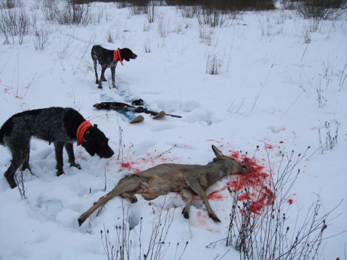 Это кстати то же к вопросу о том что нет универсальных легавых . Подняли косулю, прогнали полукругом ок 15мин, выставили на выстрел, кинулись к битой, но поняли, что давить уже не надо, полизали горячую кровь, потом через полчаса спокойно сделали по паре работ по вале с посылом, тут же опять подняли косулю, опять гон, выстрел, через некоторое время - опять стойка, посыл, подьём птицы. И что самое главное - всё это делается так как надо и тогда когда надо : никто птицу с голосом не гоняет, а по зверю, поднятому с лёжки никто на стойке не стоит.