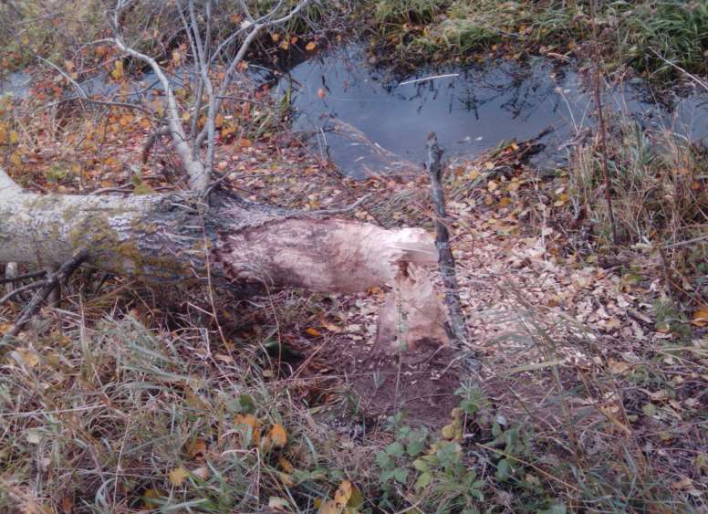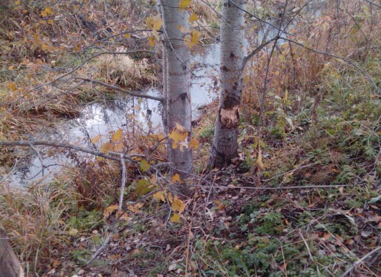 метрах в 300 от плотины завалили еще одну осинку (самую большую, но упала она неудачно, не в воду, а в противоположную сторону. остальные 5 деревьев только опробованы, одно уже по кругу объедено на 1,5-2 см)