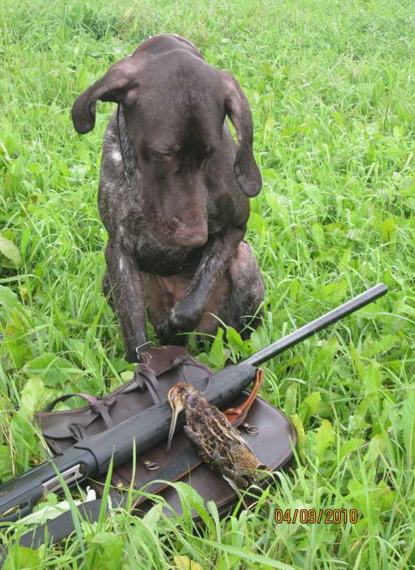Навожу Мичела против ветра, через некоторое время стойка, команда, подъем опять бекасиное кряканье. Первый выстрел промах, второй есть, чисто битый бекас падает в высокую траву.