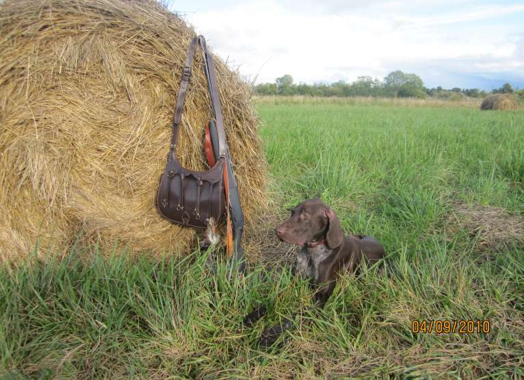 Беру собаку, успокаиваю, а у самого сердце из груди выпрыгивает, пацан молодец - сработал, под дождем, да еще и с заходом по ветру! Подвожу Мичела к месту падения птицы, усаживаю в 1,5 метрах, а птицы не вижу, на краю канавы, куда он падал только плотным ковром лежит пласт сухой травы. Вот тебе и второй дополнительный вопрос на экзамене - найди битую птицу. Мичел сделал небольшой круг и резко ставит лапу на ковер сухой травы. Поднимаю пласт прошлогодней травы, подранок там. Молодец - зачет! Успокаиваю барбоса, достаю бутербродик, половину отдаю напарнику - заработал.